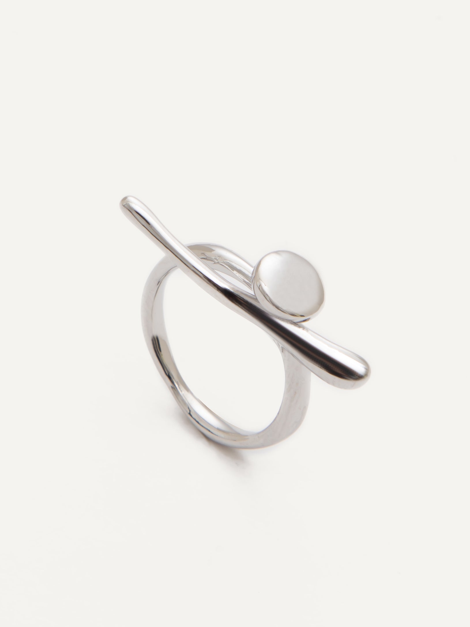 Sculptural ease. This adjustable silver-tone ring features a fluid, modern silhouette with a smooth bar and circular accent. Its open design allows for a comfortable, customizable fit while adding a contemporary touch to any look.