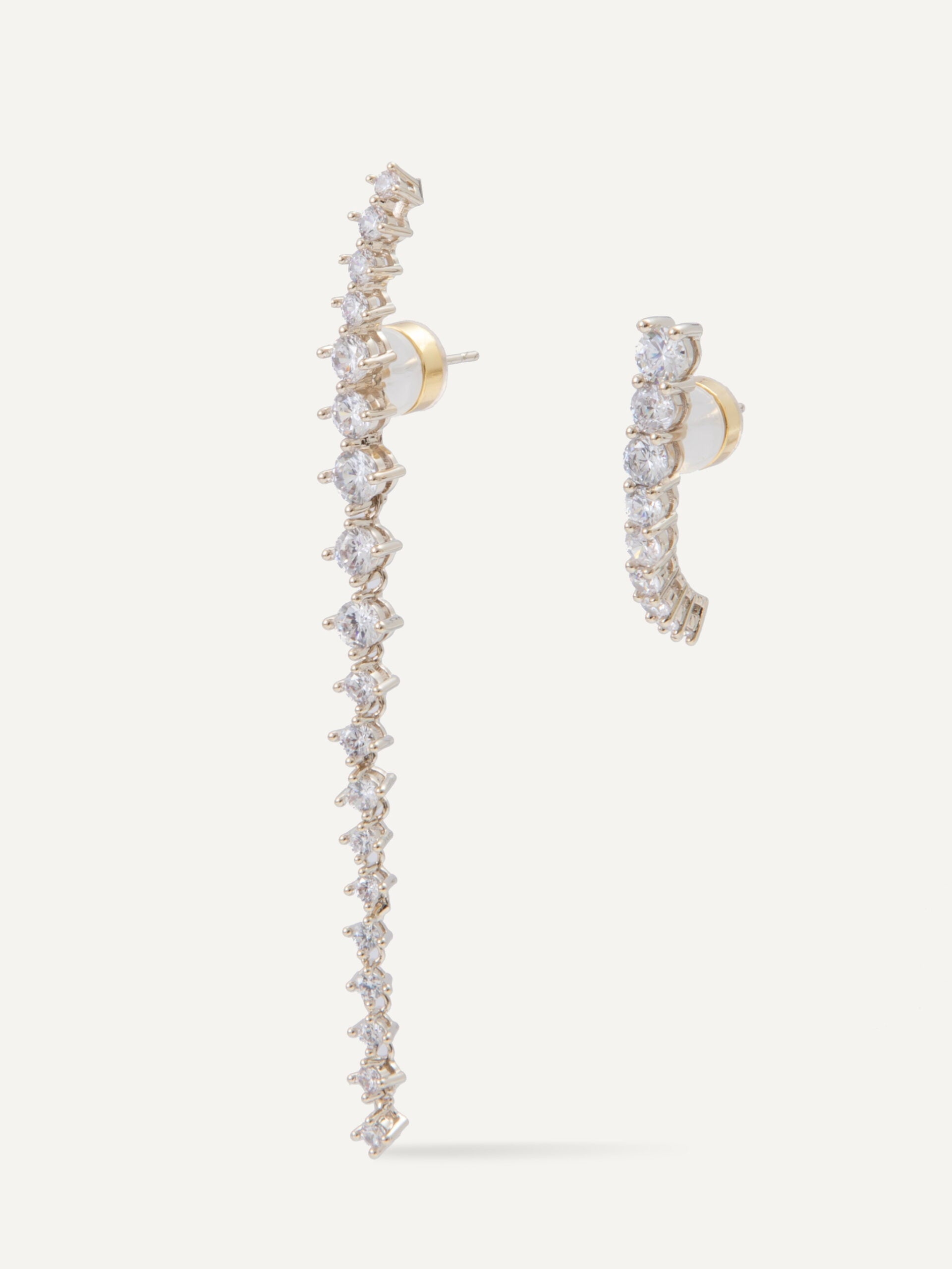 The Athalia earrings are a statement of elegance with a touch of spontaneity. A playful and trendy duo featuring one thin elongated stud and one dangling strand.