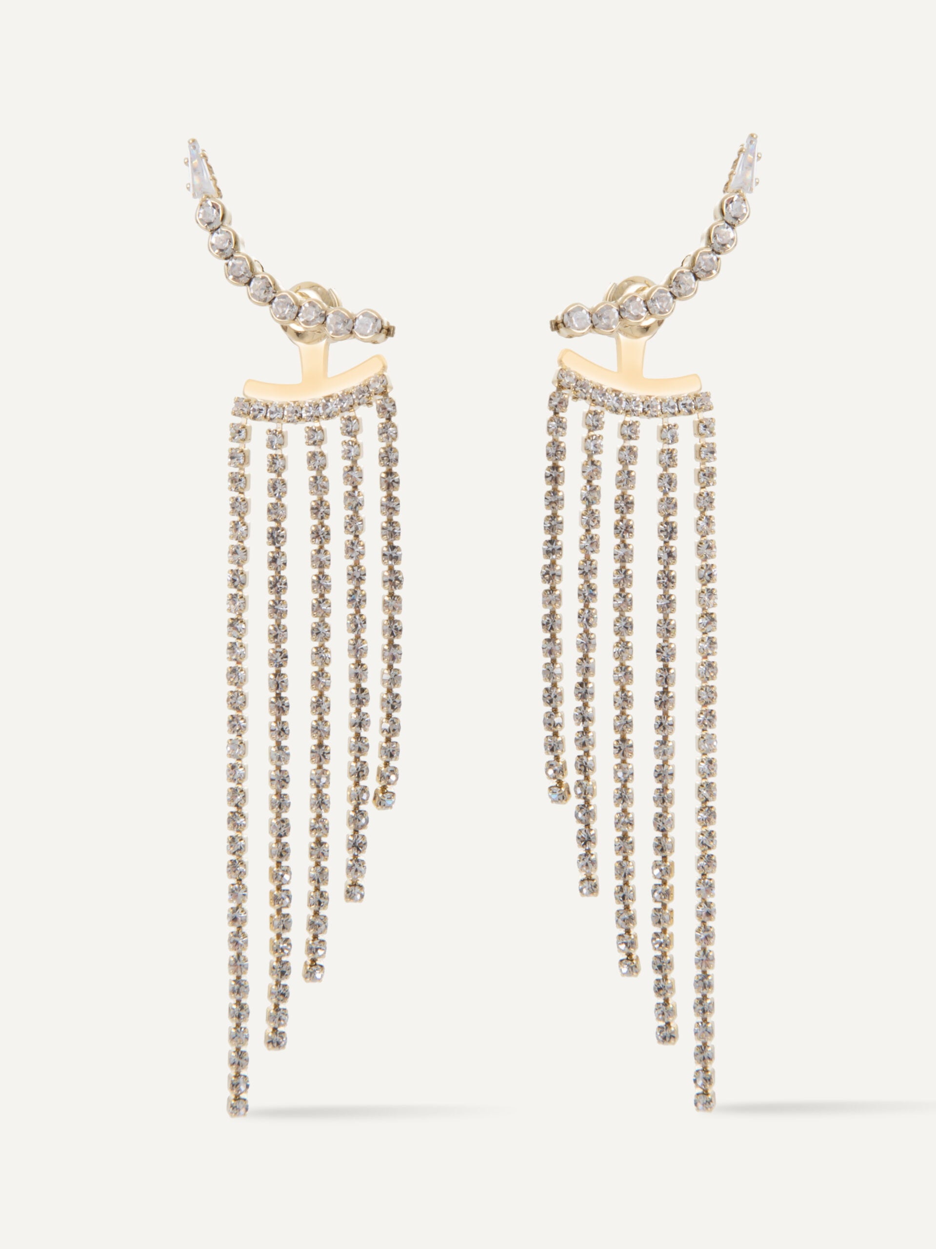 Jacket earring with a subtle elongated cubic zirconia stud, adorned with five cascading strands of cubic zirconia pave crystals. The high-end design ensures a touch of sophistication for a truly glamorous accessory.