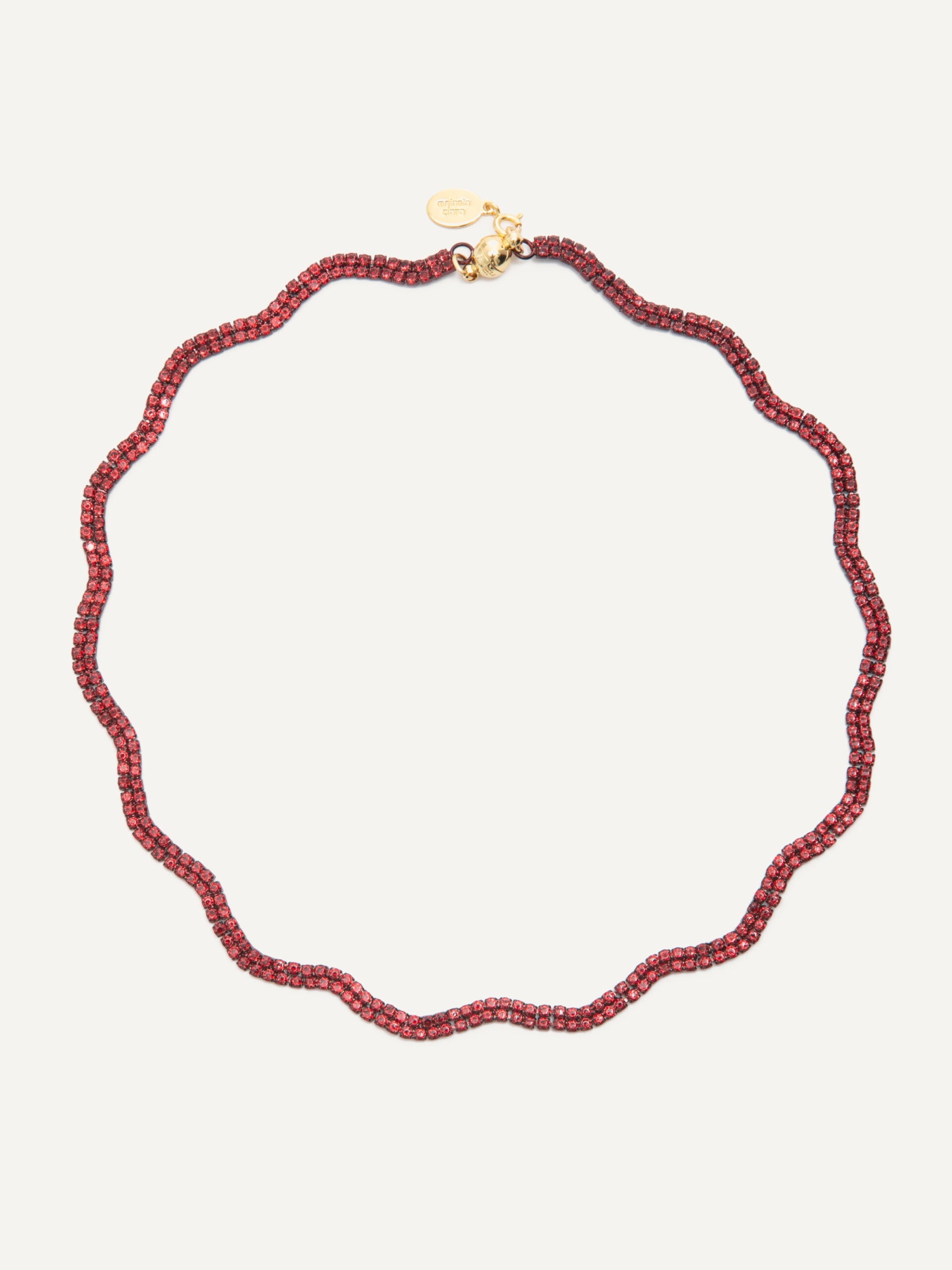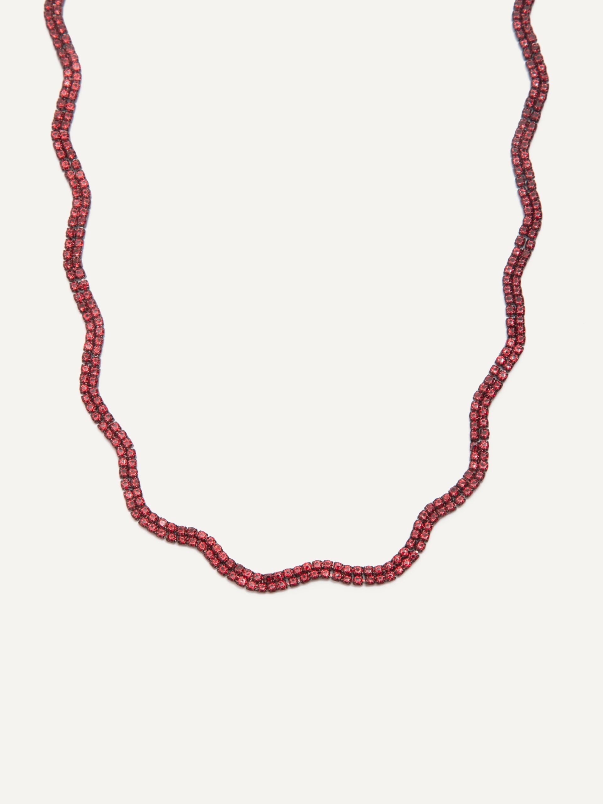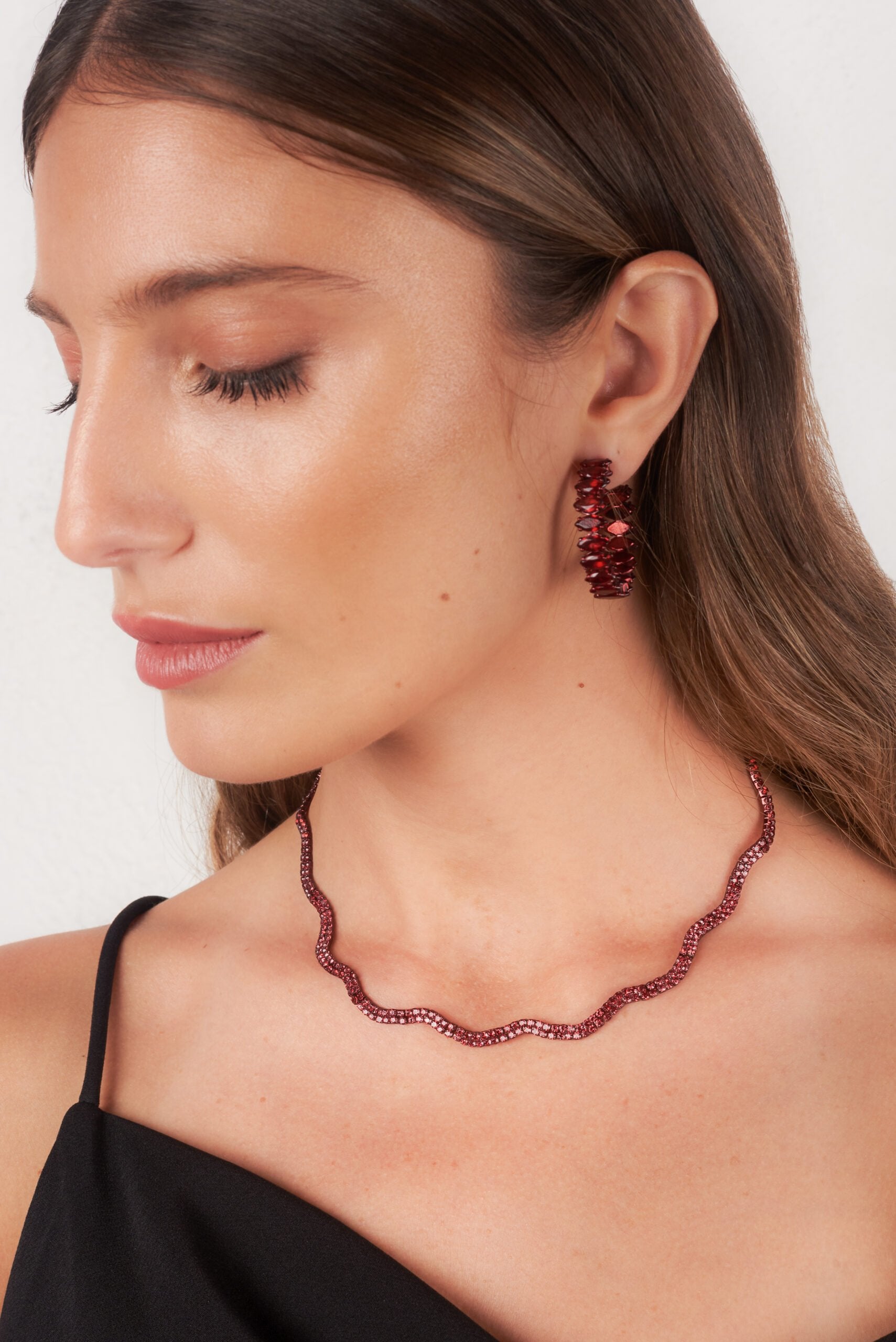 This necklace effortlessly blends timeless elegance with a modern twist. Its fluid wavy design adorned with radiant crystals and a striking metallic red finish make it a perfect statement piece for any occasion.