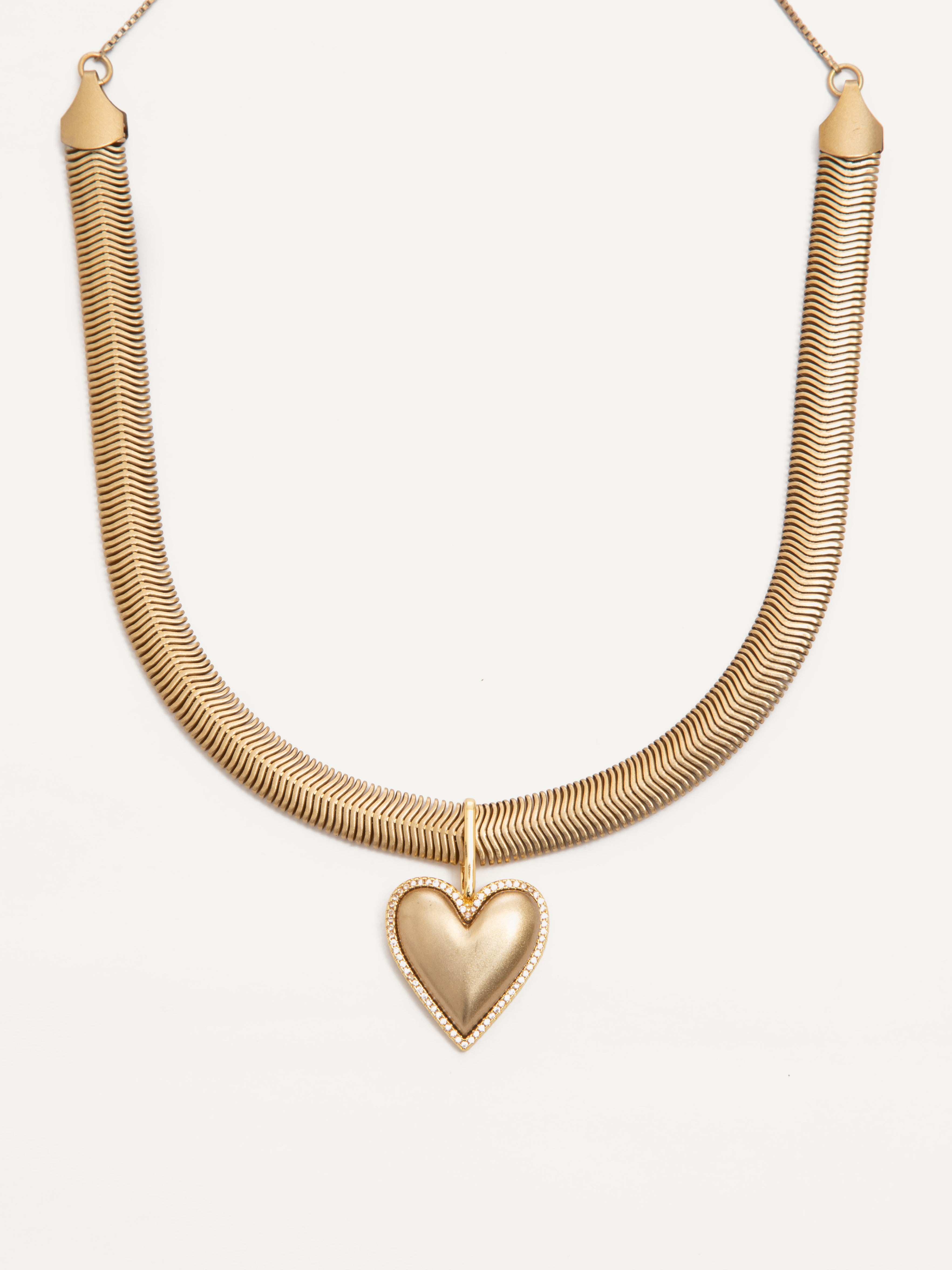 Soft, flat fishtail chain pull choker with heart pendant