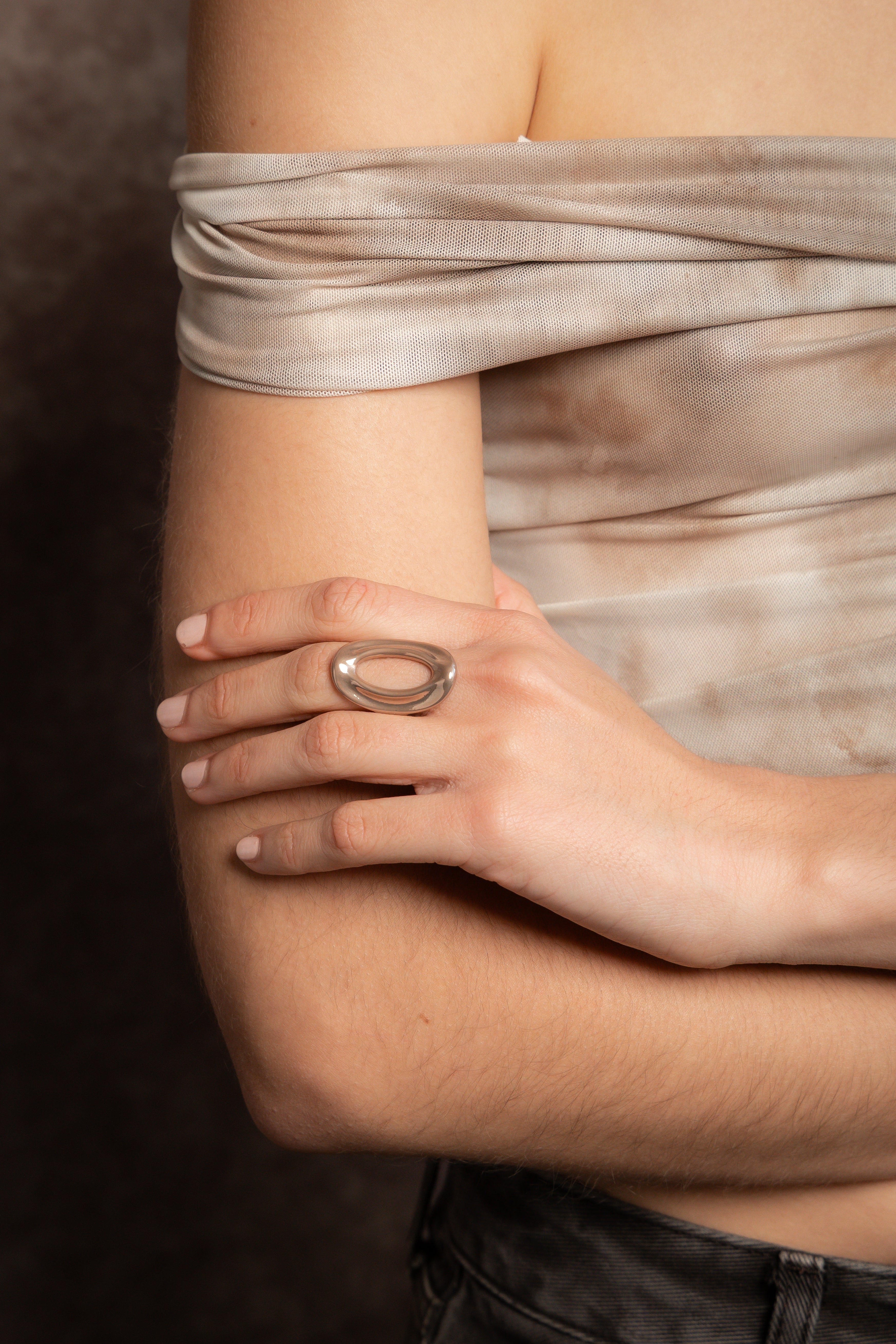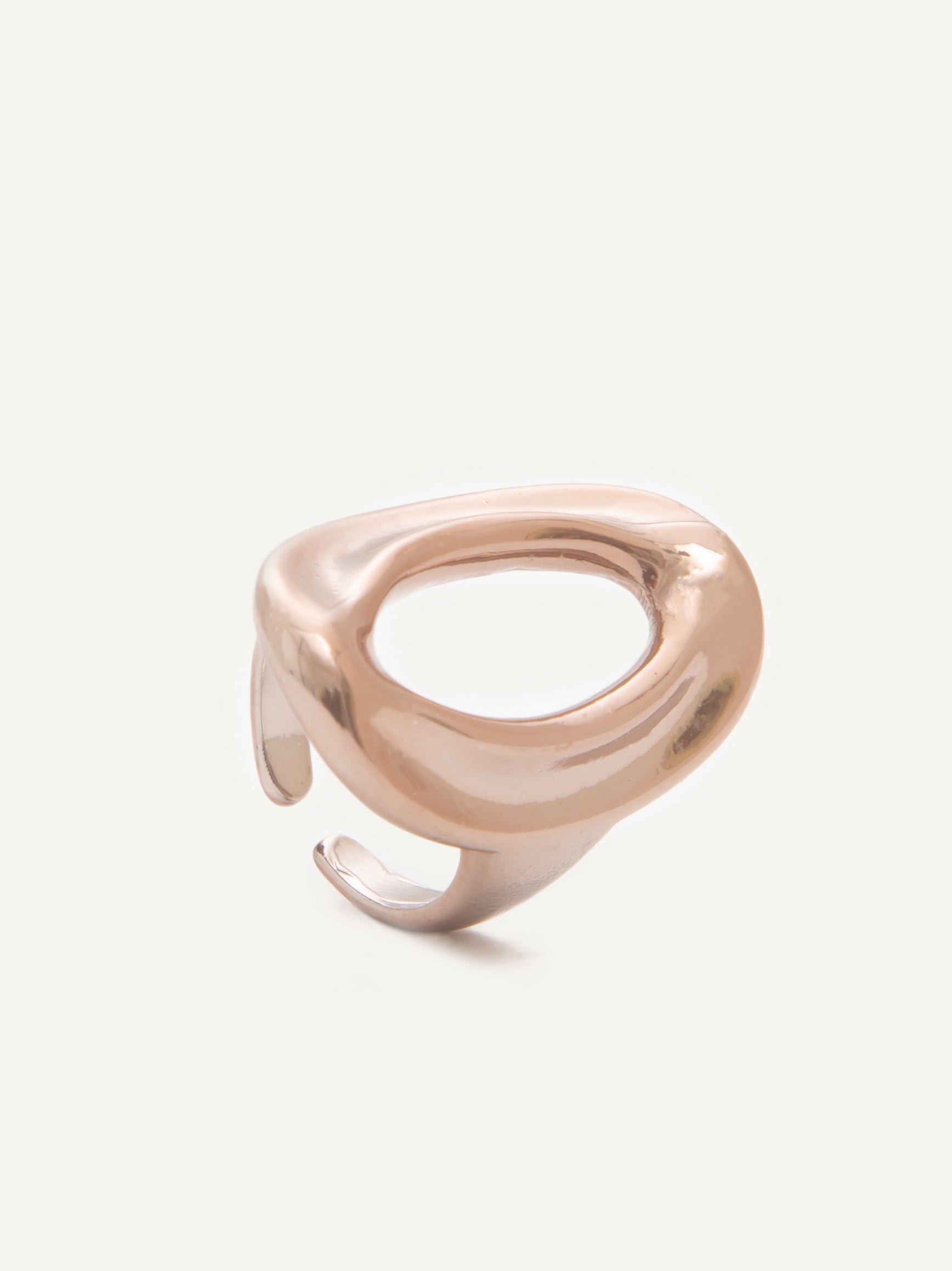 Open form. This adjustable ring features a sculptural, hollowed design with smooth edges and a polished finish. Its fluid shape and open band make it easy to wear while adding a modern statement to any look.