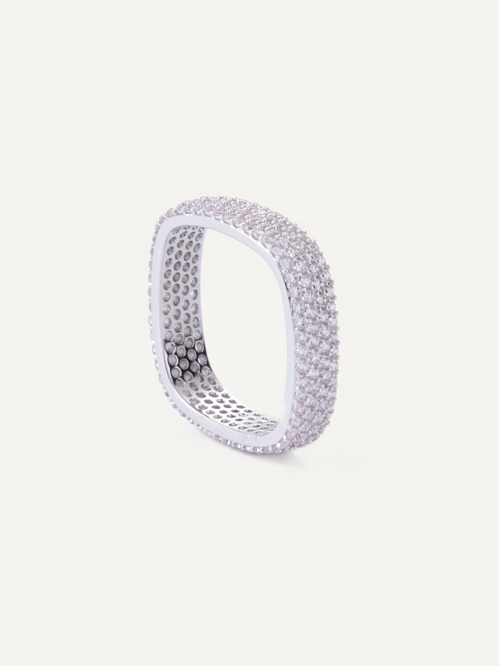 The squared design adds a contemporary twist to the classic eternity ring, making it a stylish and versatile piece adorned with cubic zirconia crystals.
