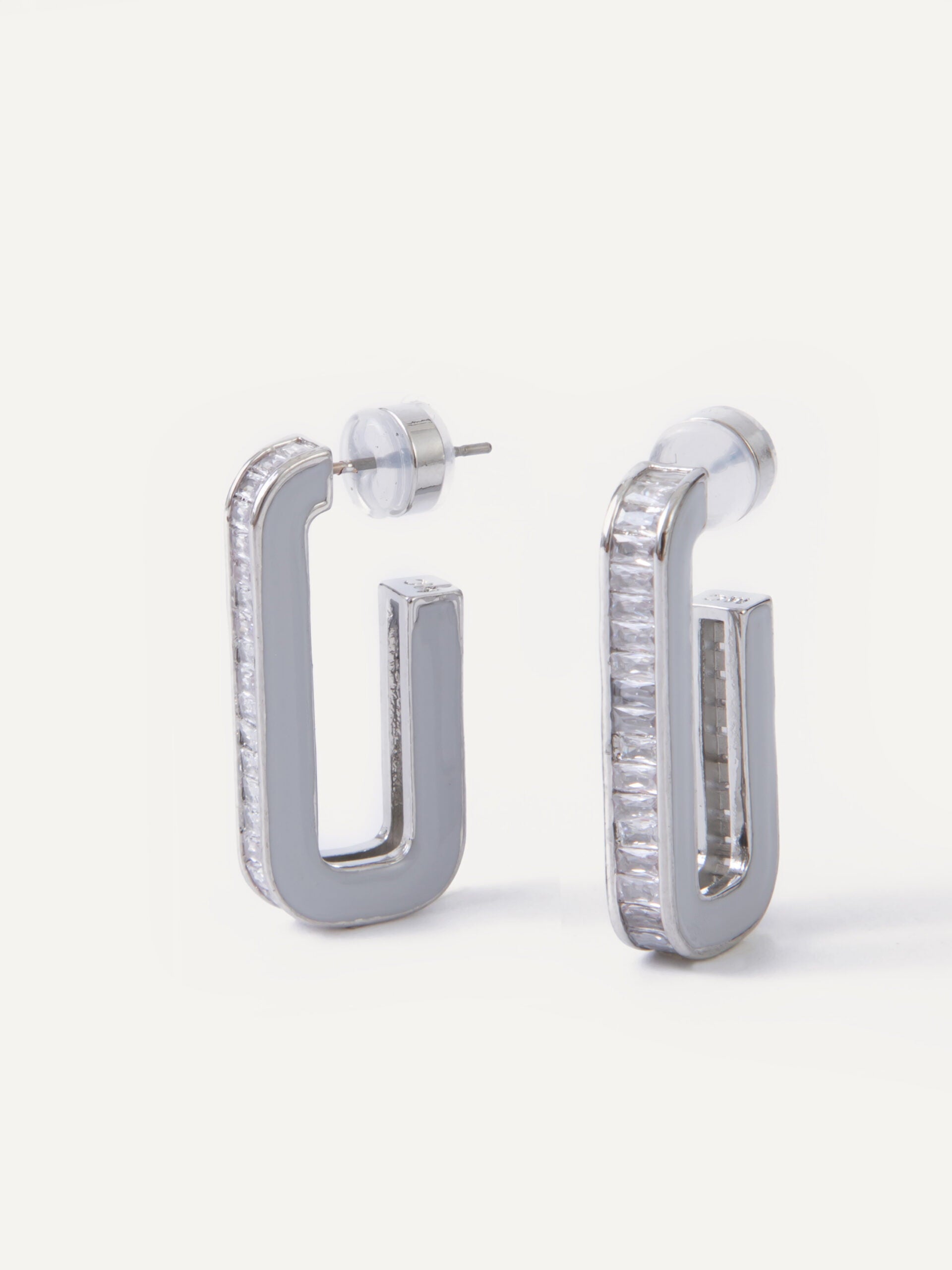 Enameled rounded rectangle hoop earrings with baguette cubic zirconia crystals. Post back closure.