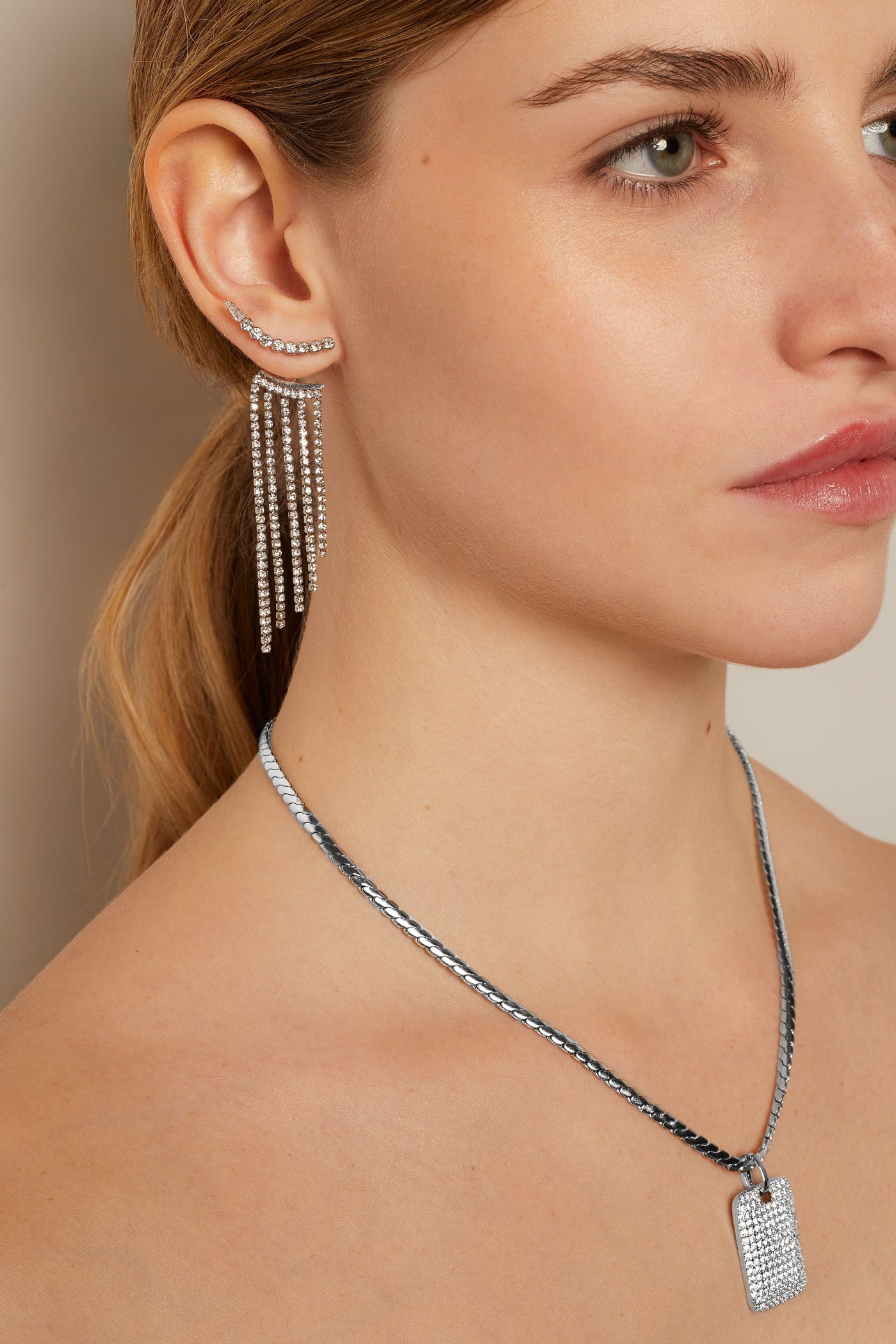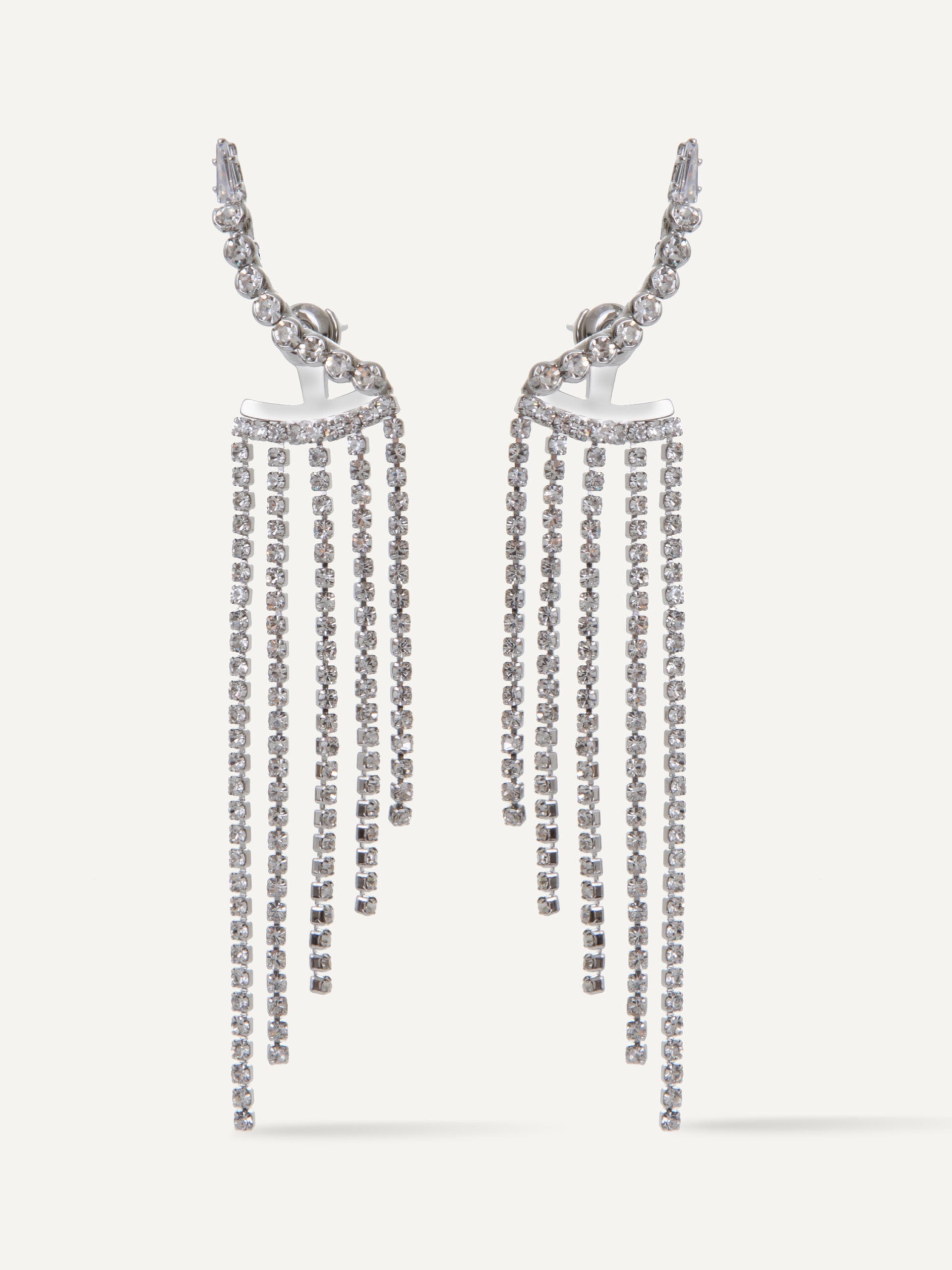 Jacket earring with a subtle elongated cubic zirconia stud, adorned with five cascading strands of cubic zirconia pave crystals. The high-end design ensures a touch of sophistication for a truly glamorous accessory.