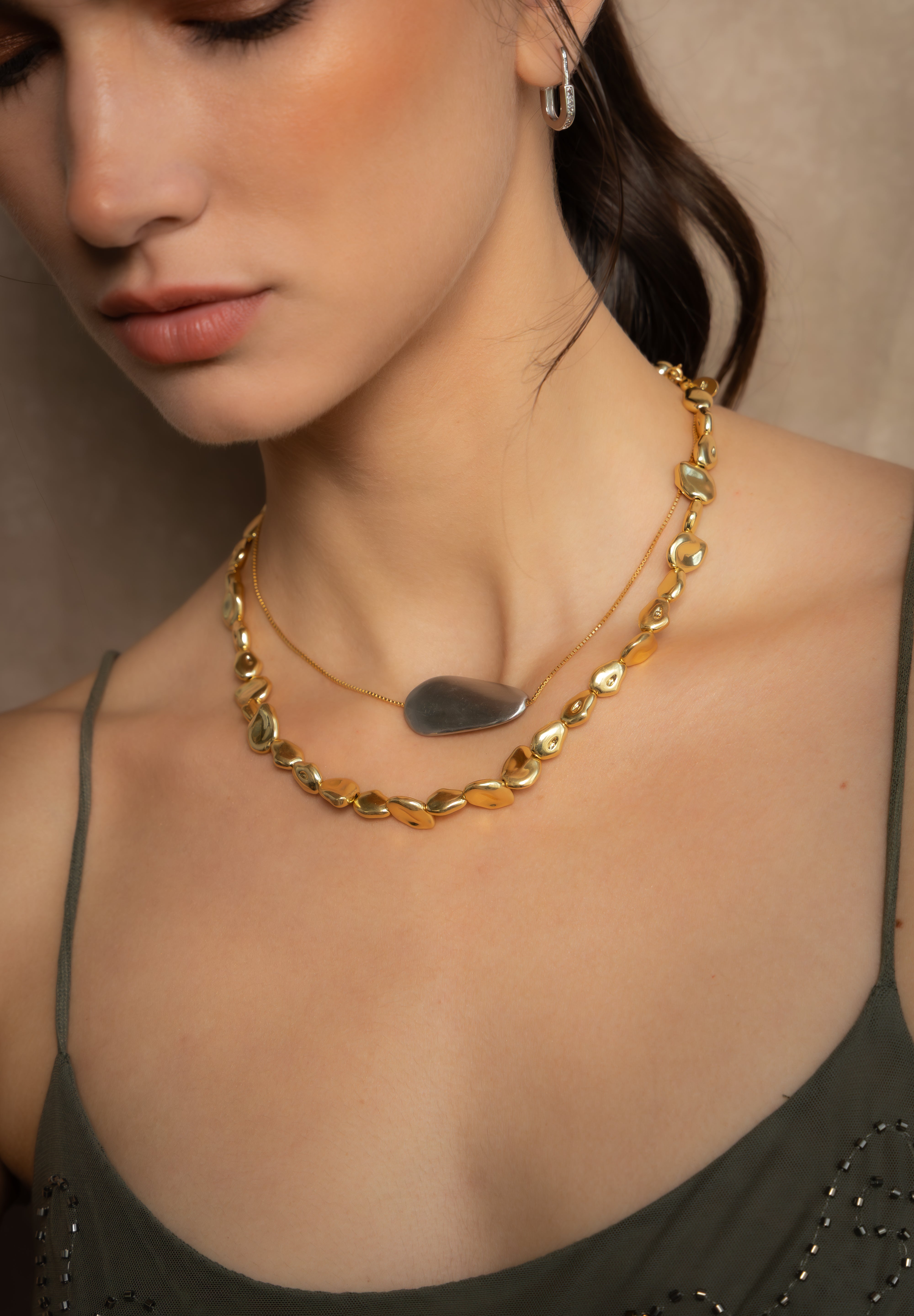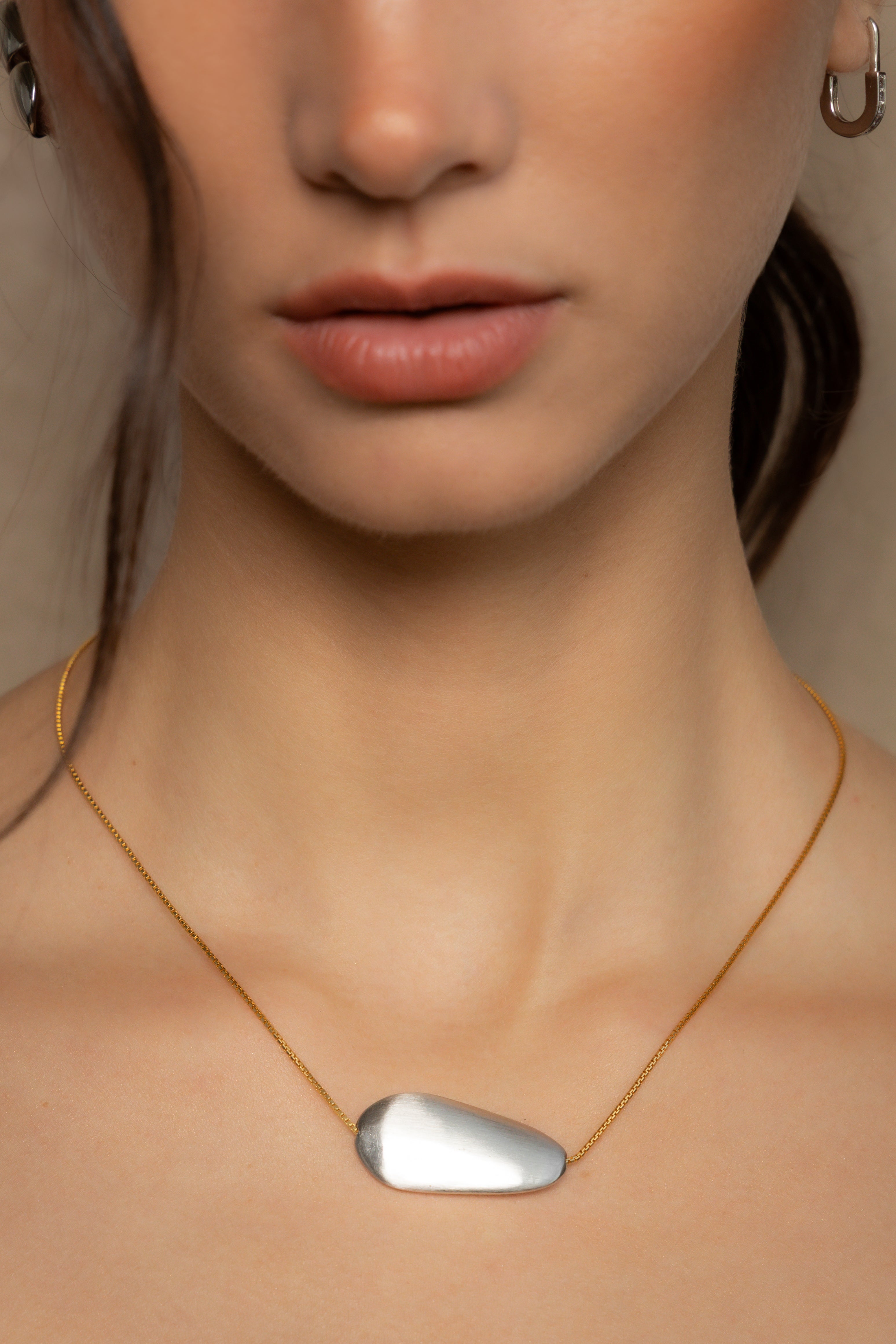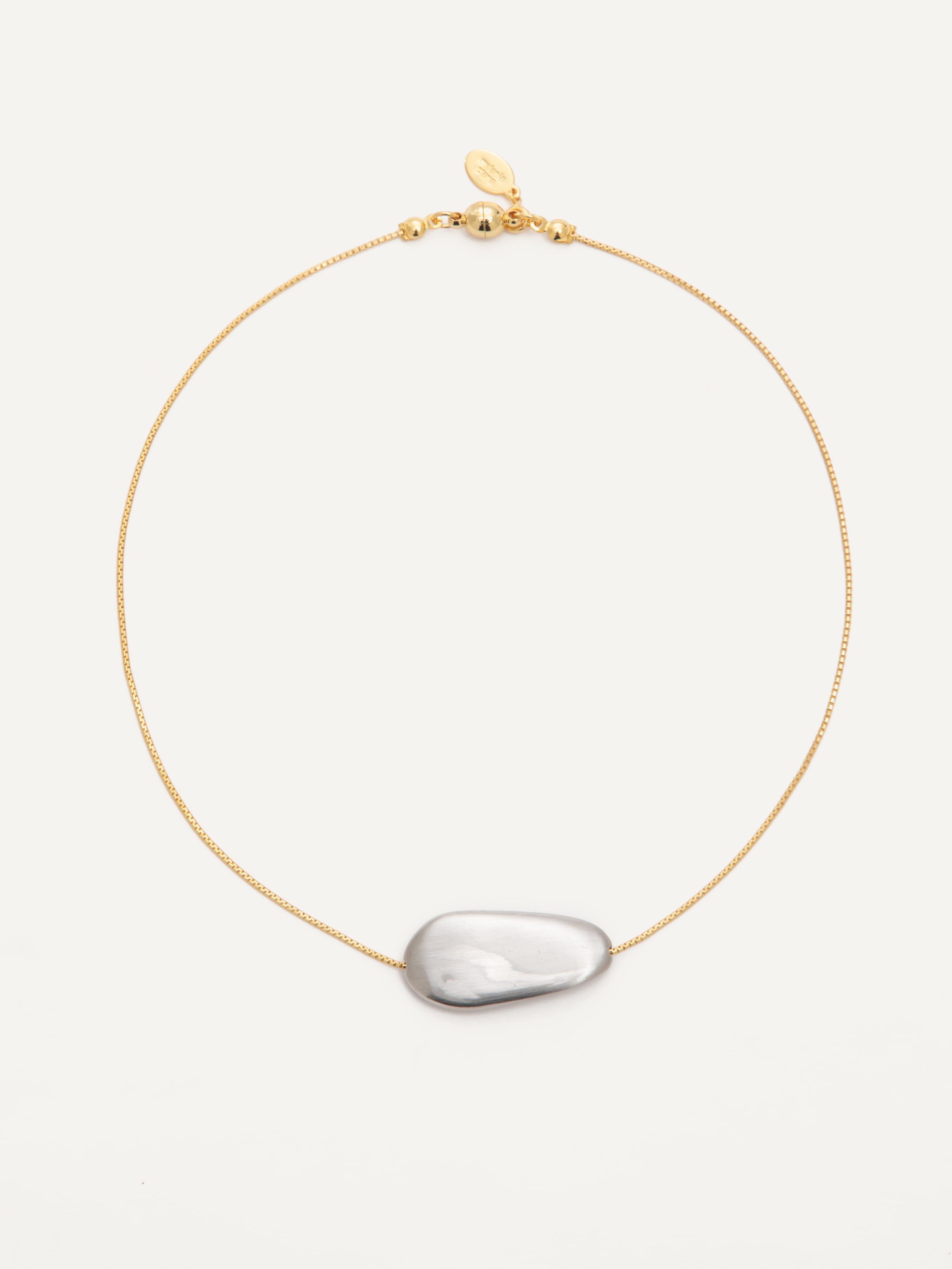Minimal statement. This necklace features a fine chain centered with a smooth, pebble-like pendant. Its clean, sculptural design makes it a versatile piece that layers effortlessly or stands out on its own.