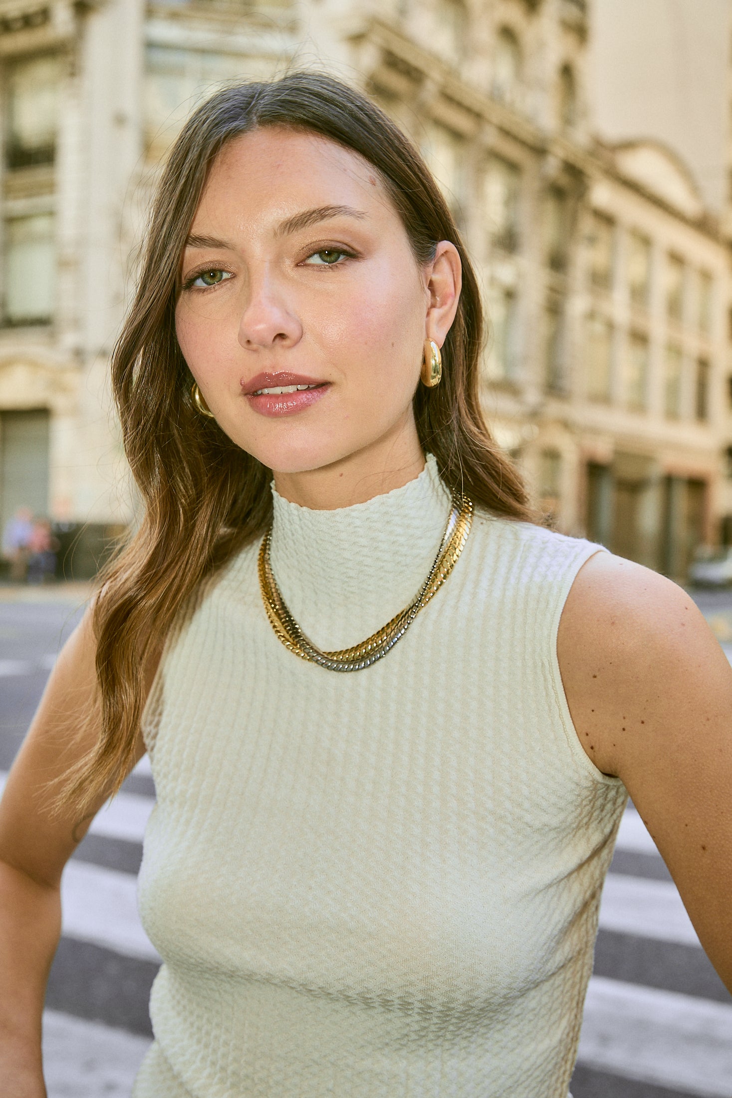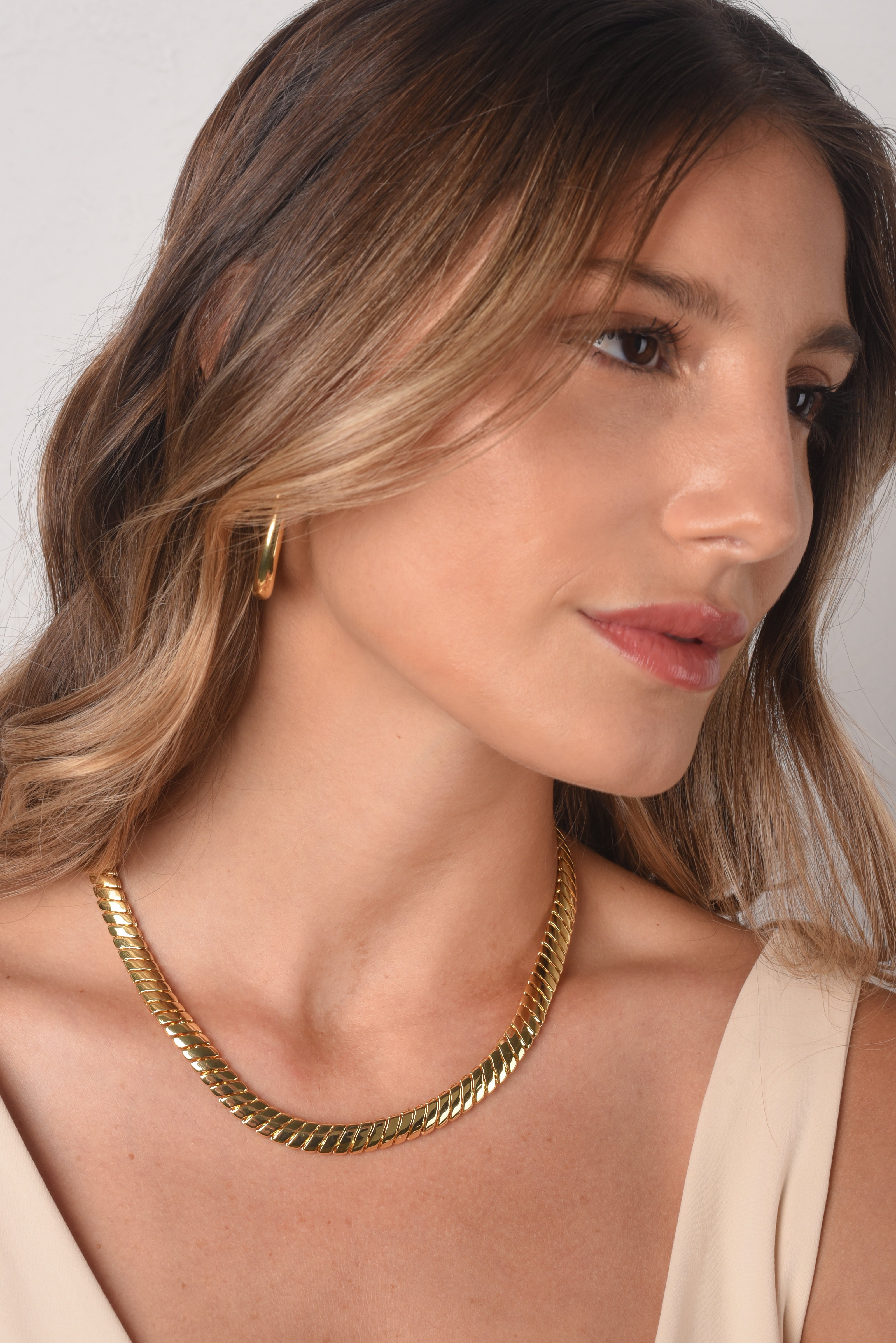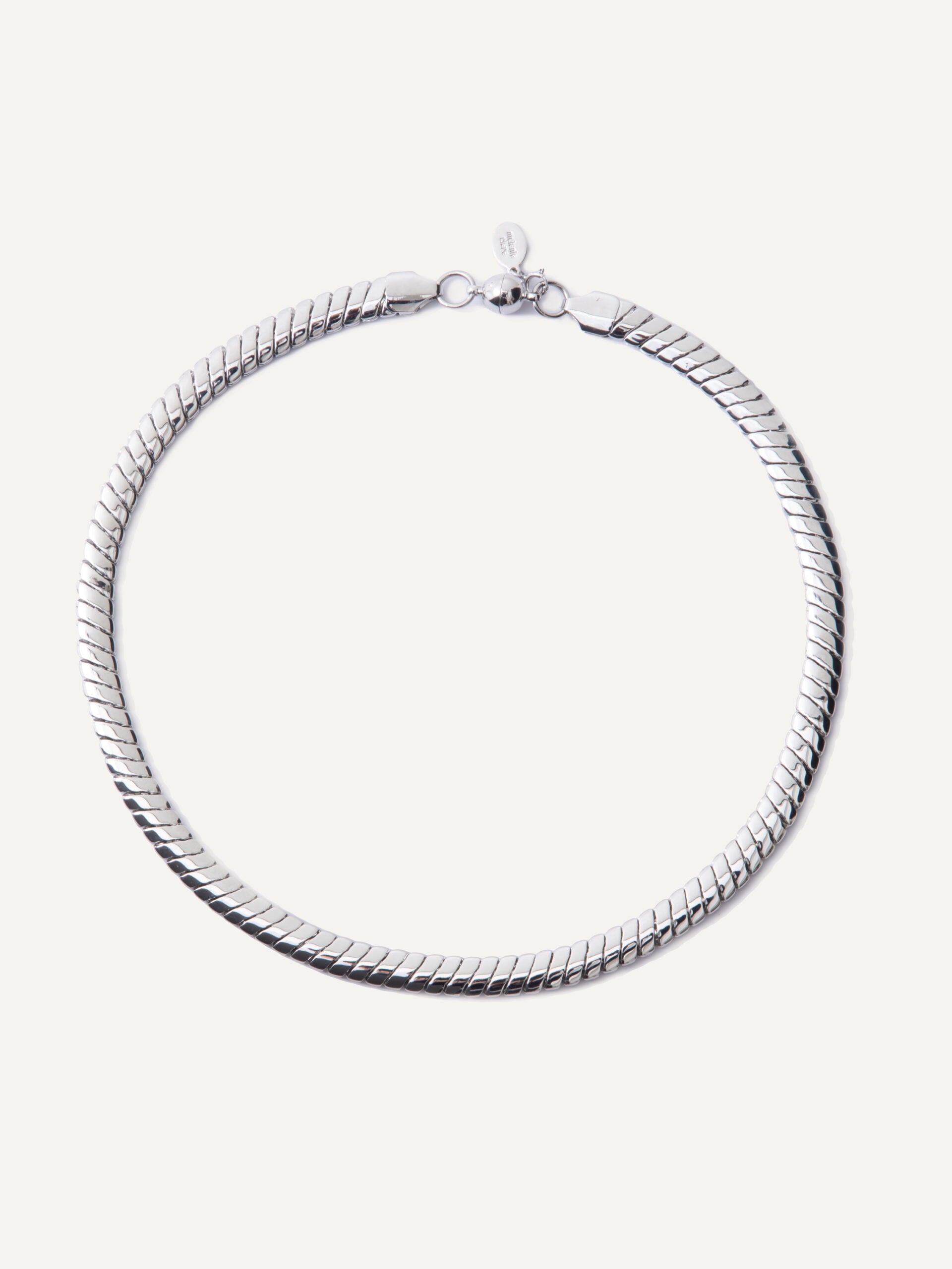 Our River necklace is a statement piece crafted with a unique enameled technique for a shimmering “Aurora Borealis” finish. This thick snake chain is designed to stand out, combining boldness with a touch of iridescent elegance that will capture all the attention.