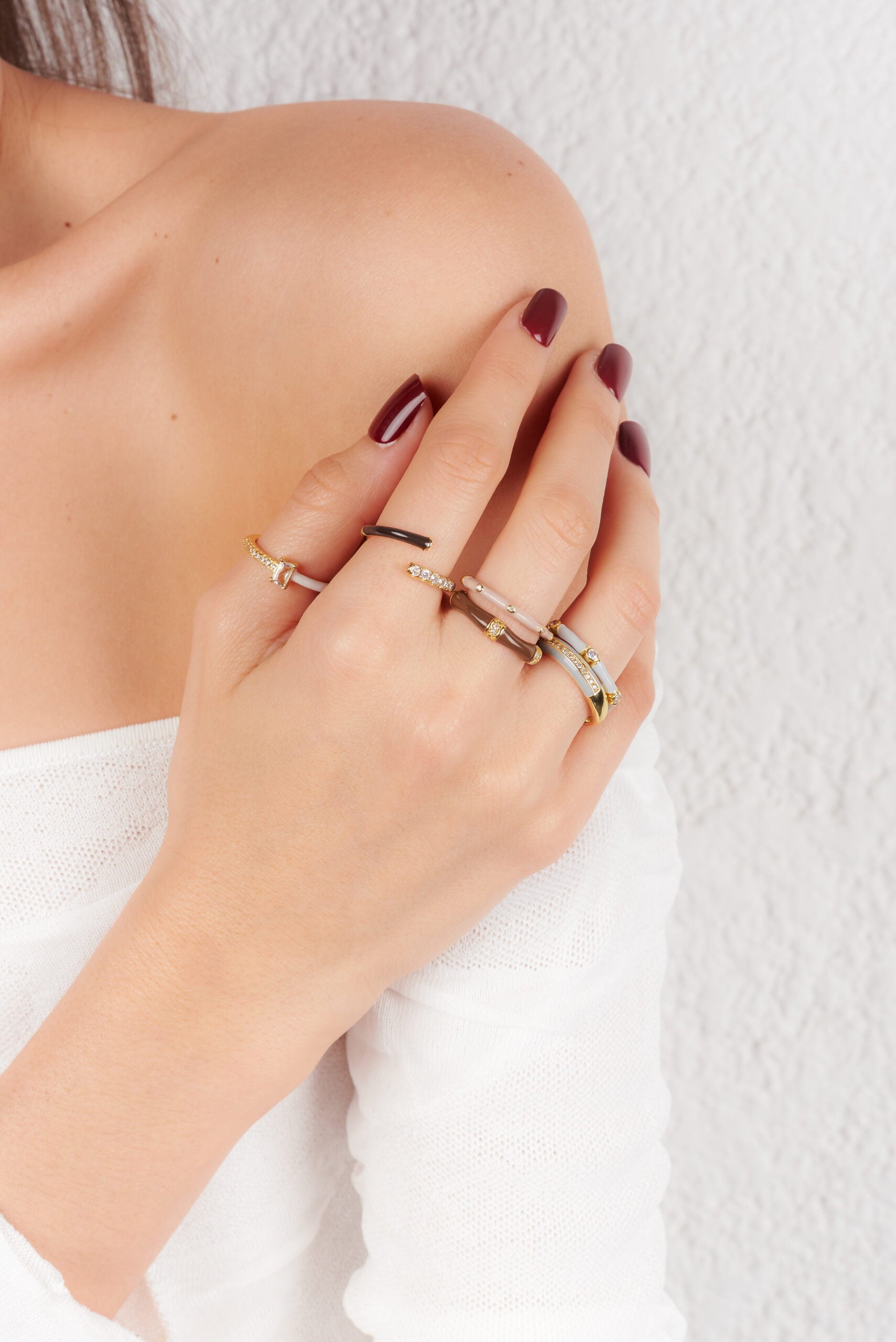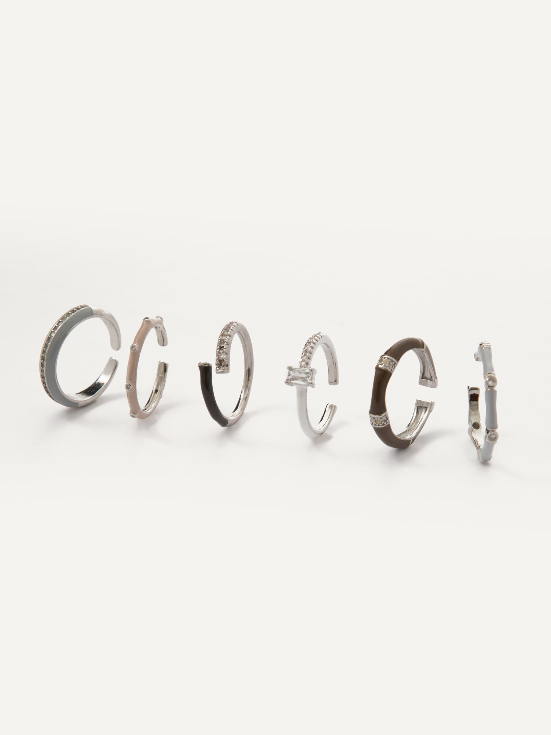 Introducing our set of six dainty rings, adorned with enamel and cubic zirconia pave crystals in neutral hues. These rings are a delicate celebration of elegance and versatility. Mix and match to create your own unique combination and embrace the timeless allure of neutral colors with a hint of sparkle.