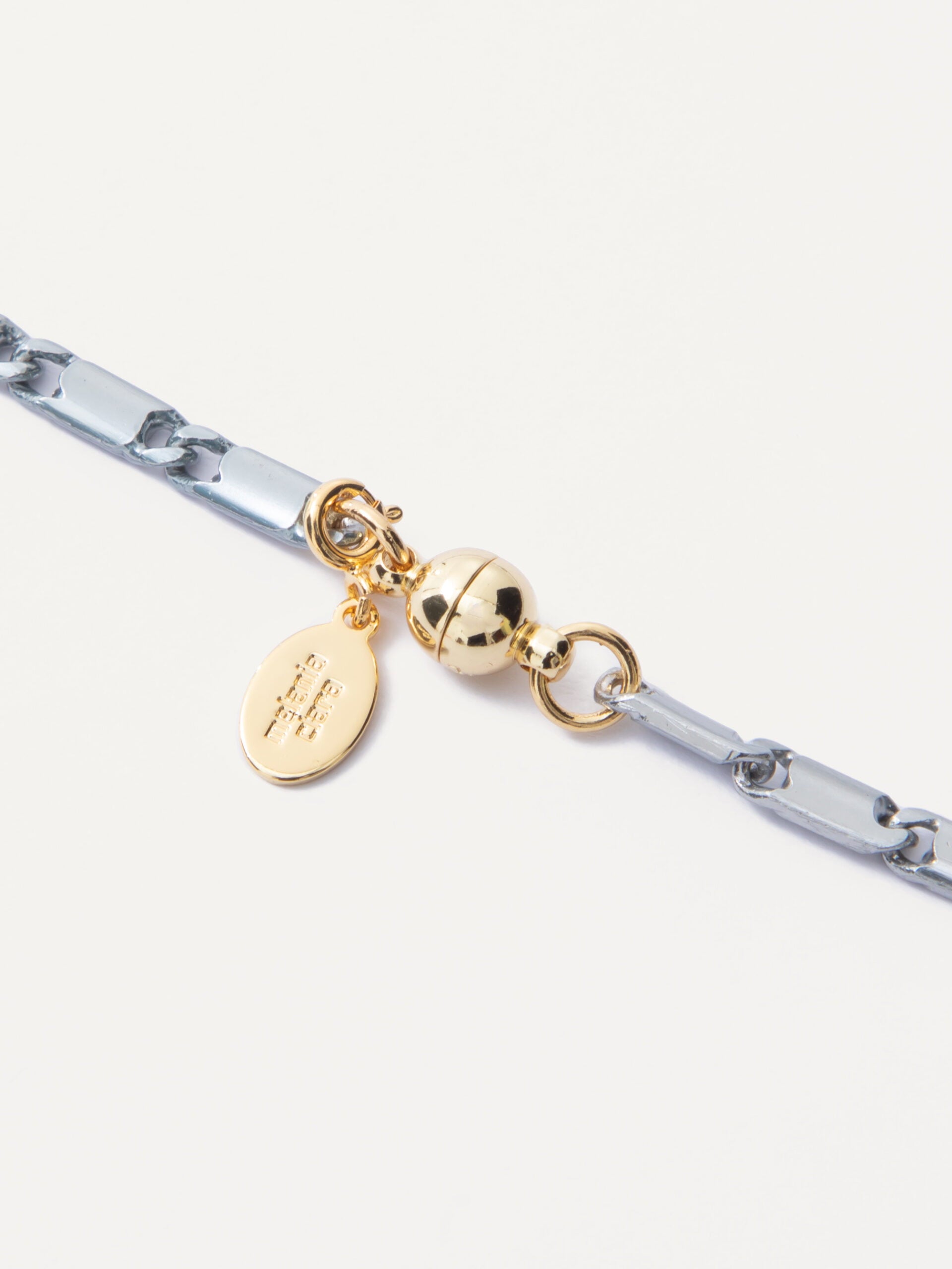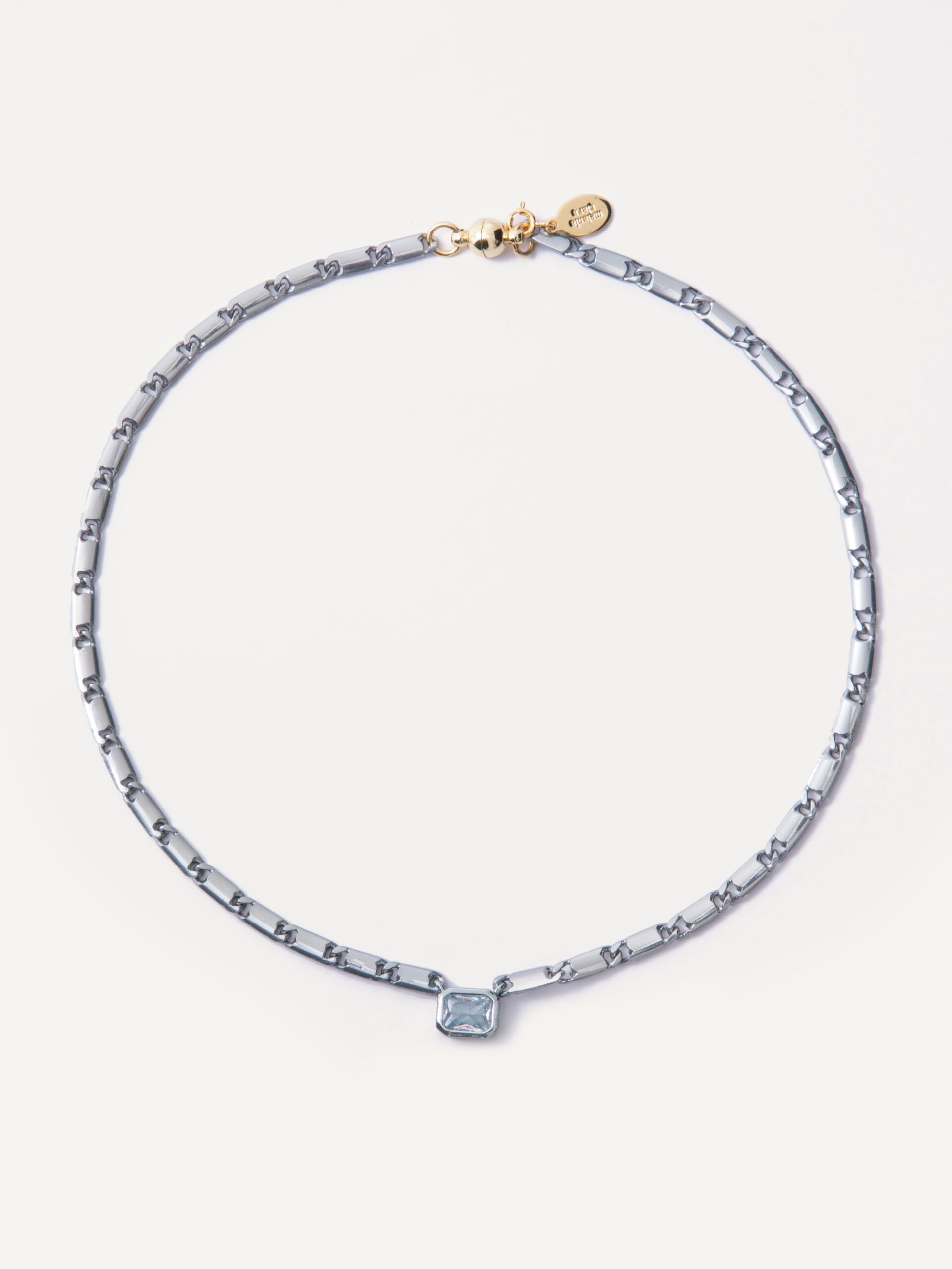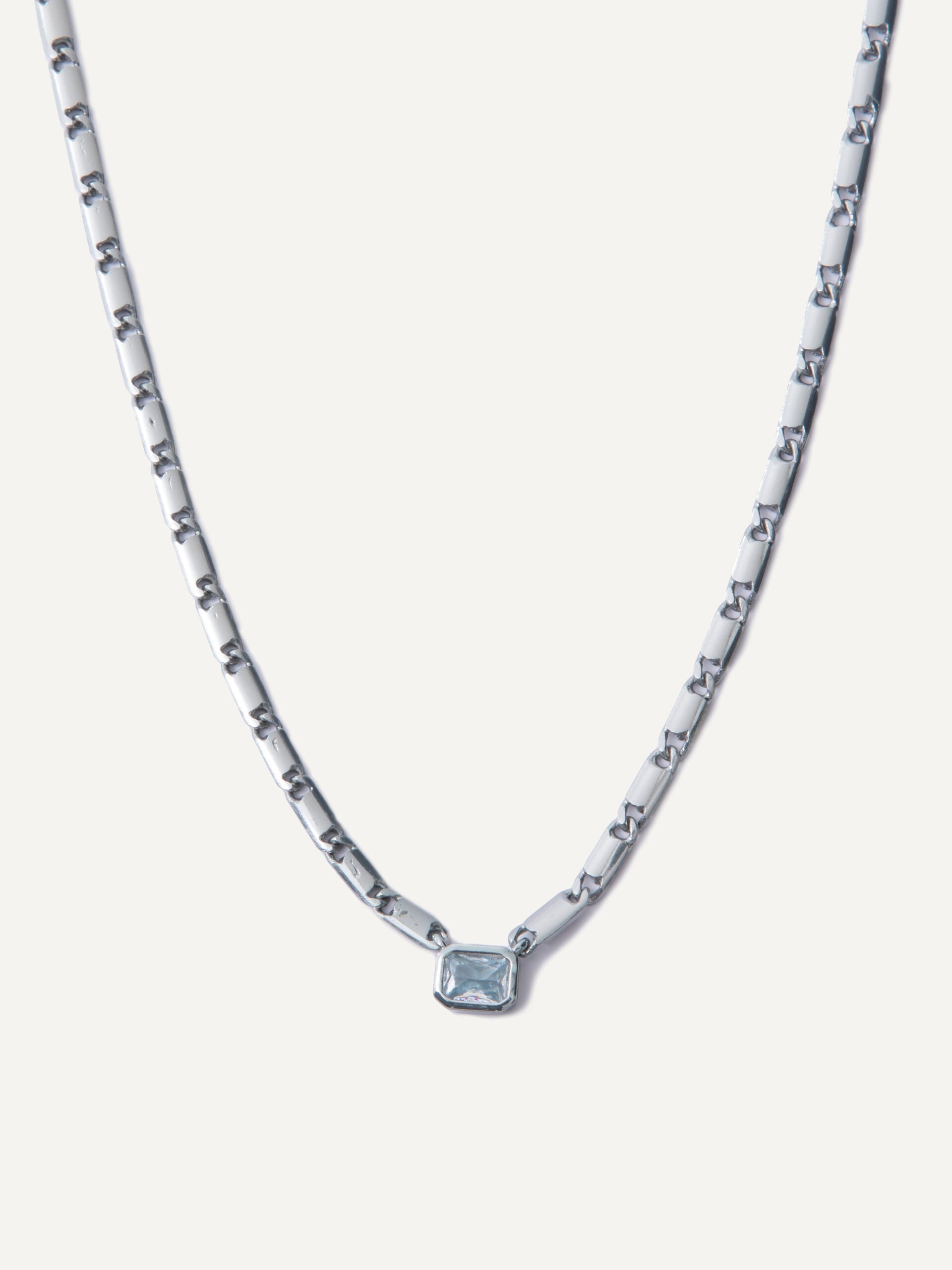 Dainty chain with solid rectangle links and rectangle crystal connector pendant.