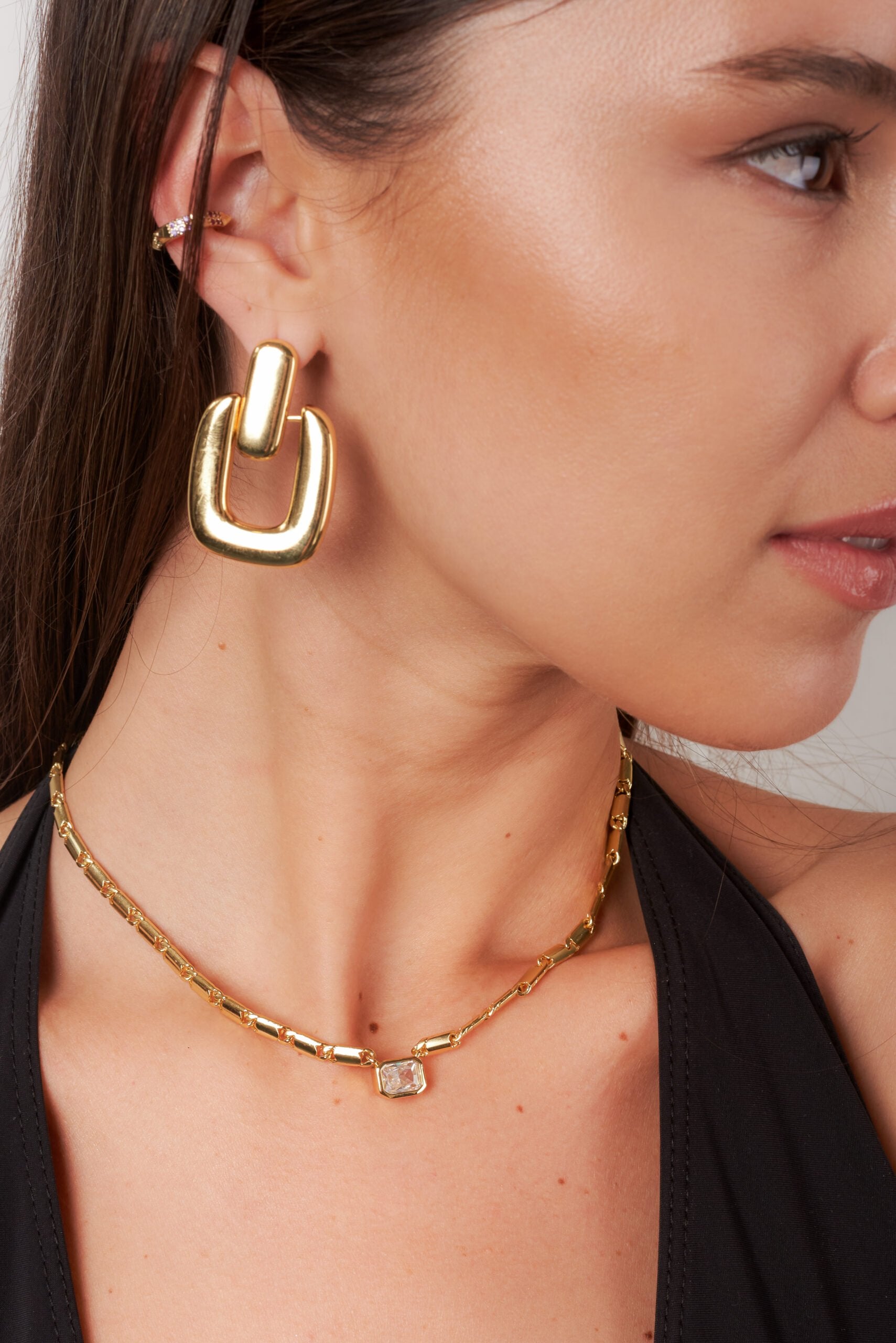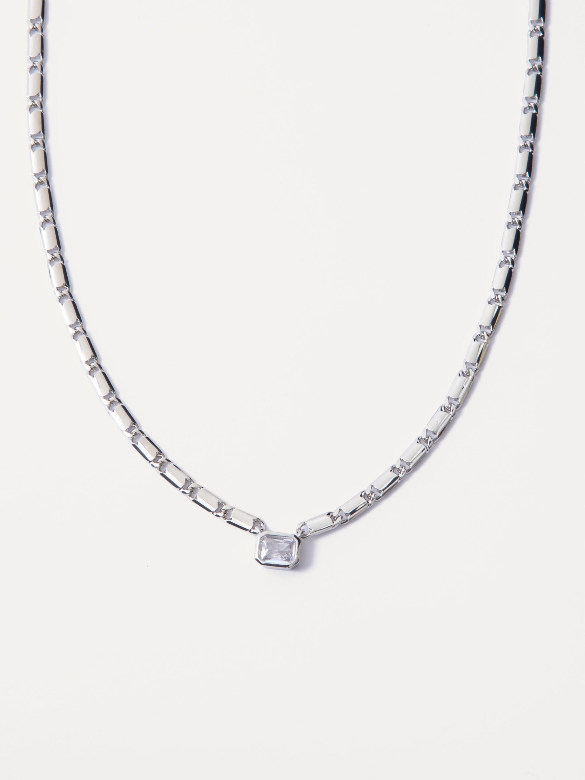 Dainty chain with solid rectangle links and rectangle crystal connector pendant.