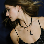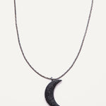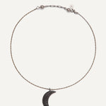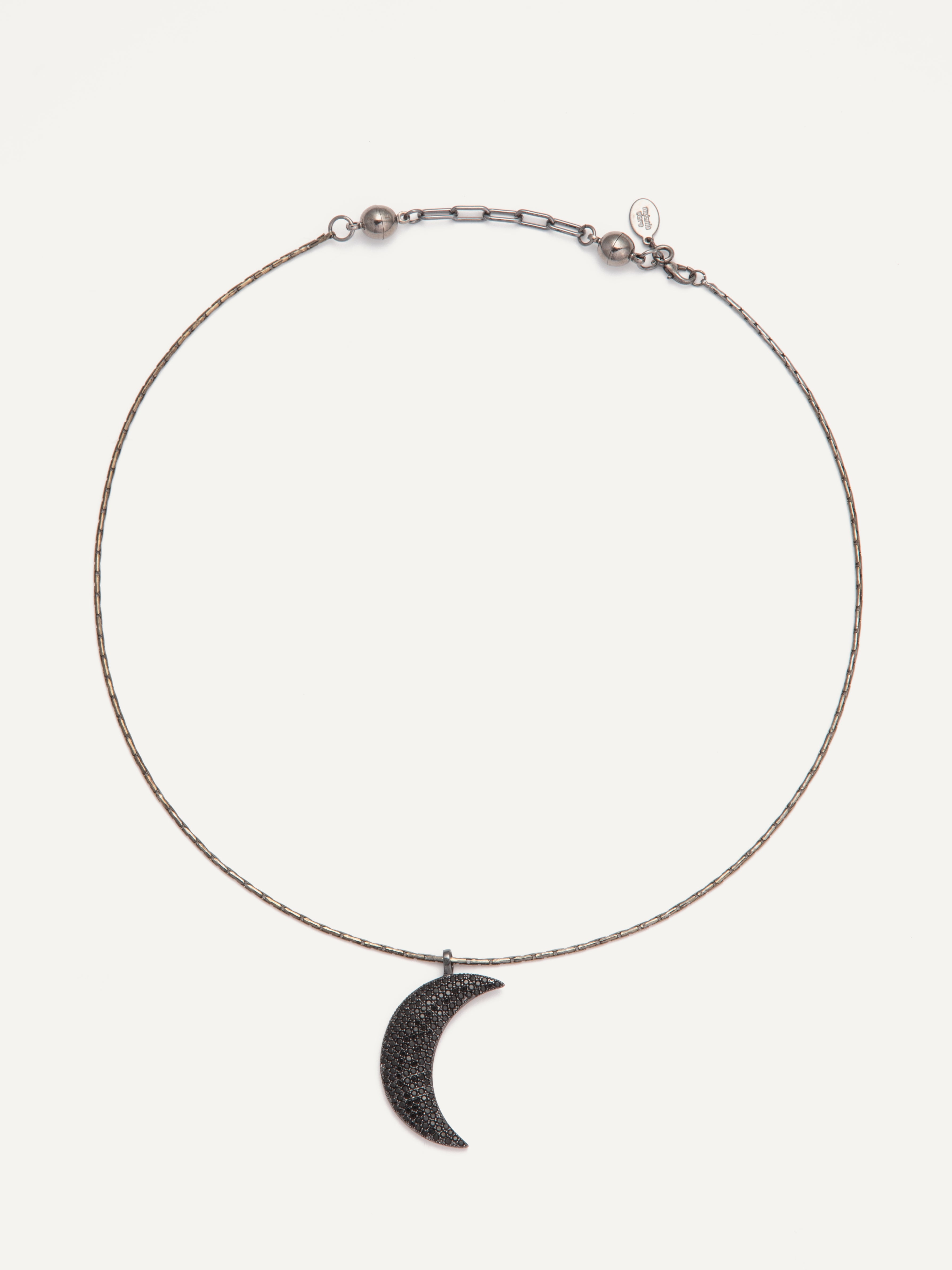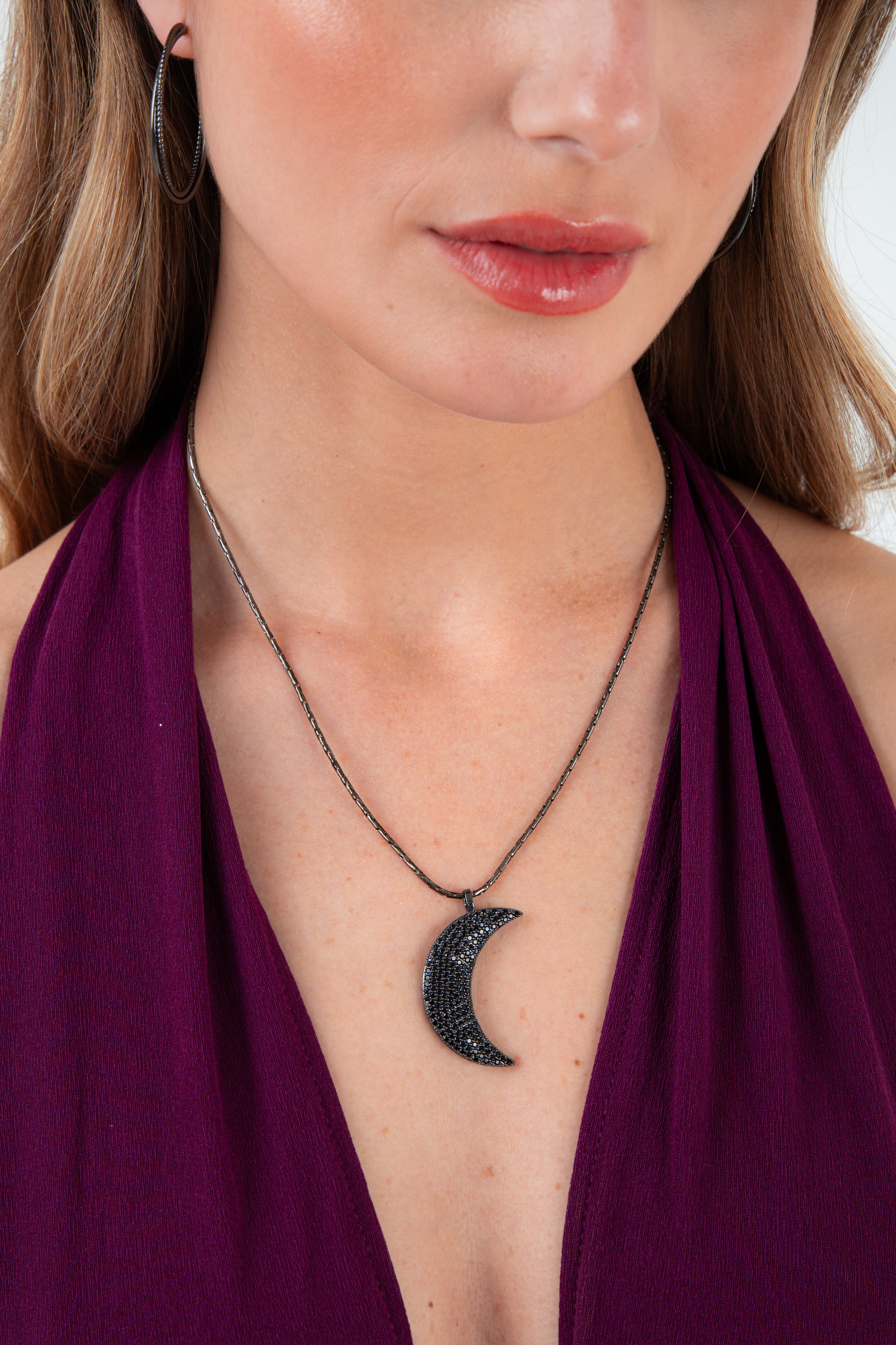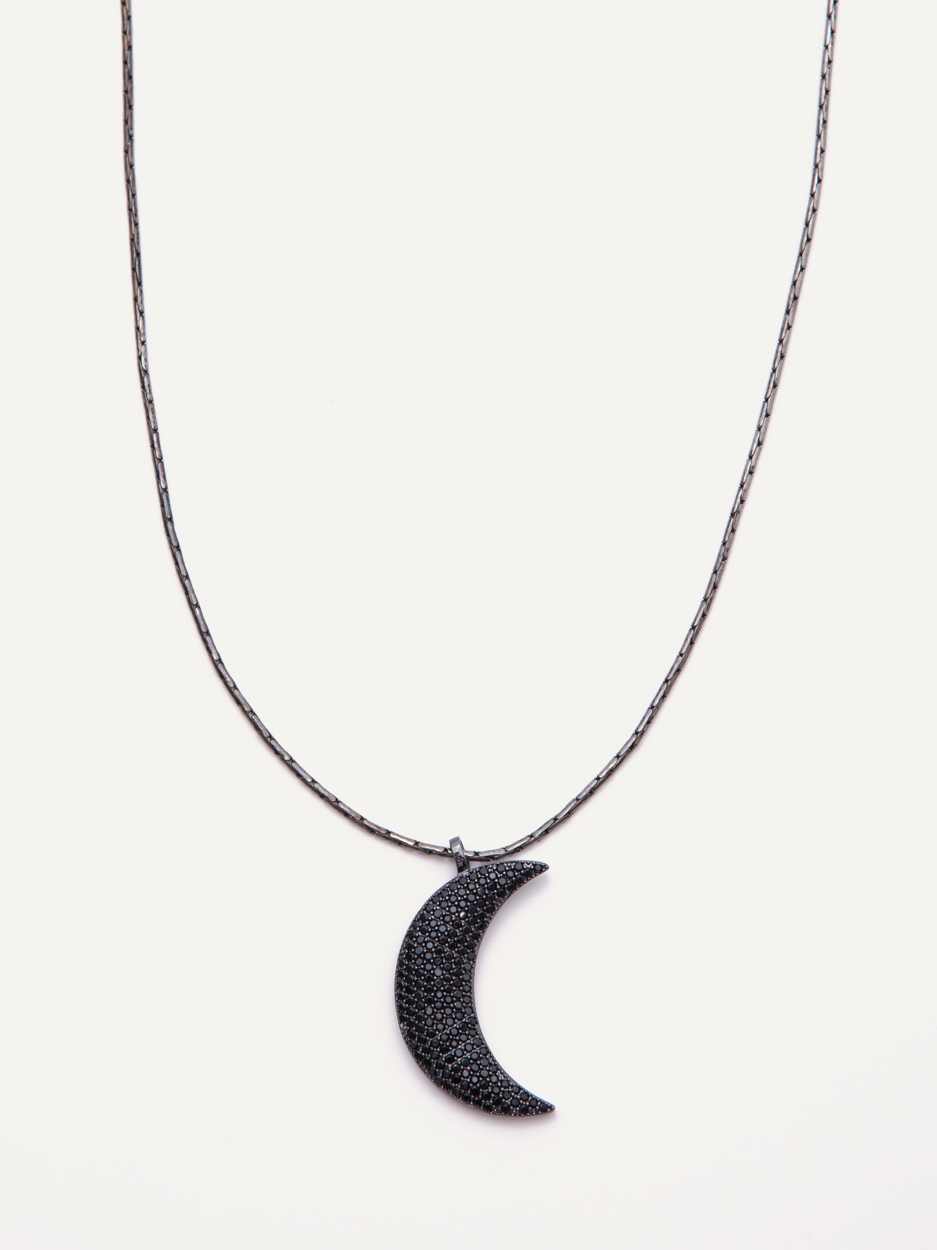 A crystal-encrusted crescent pendant that catches the light beautifully, embodying a refined celestial glow.