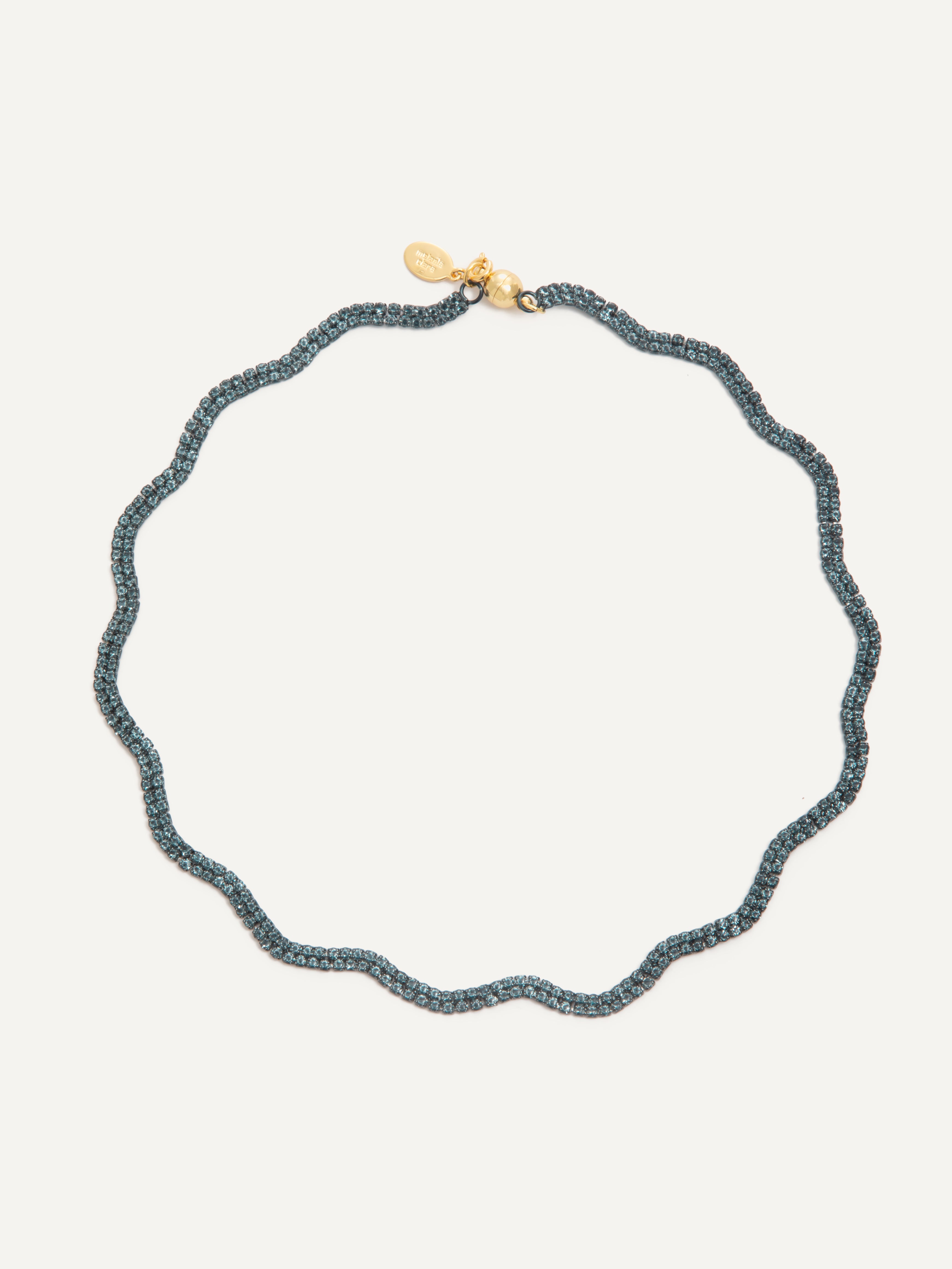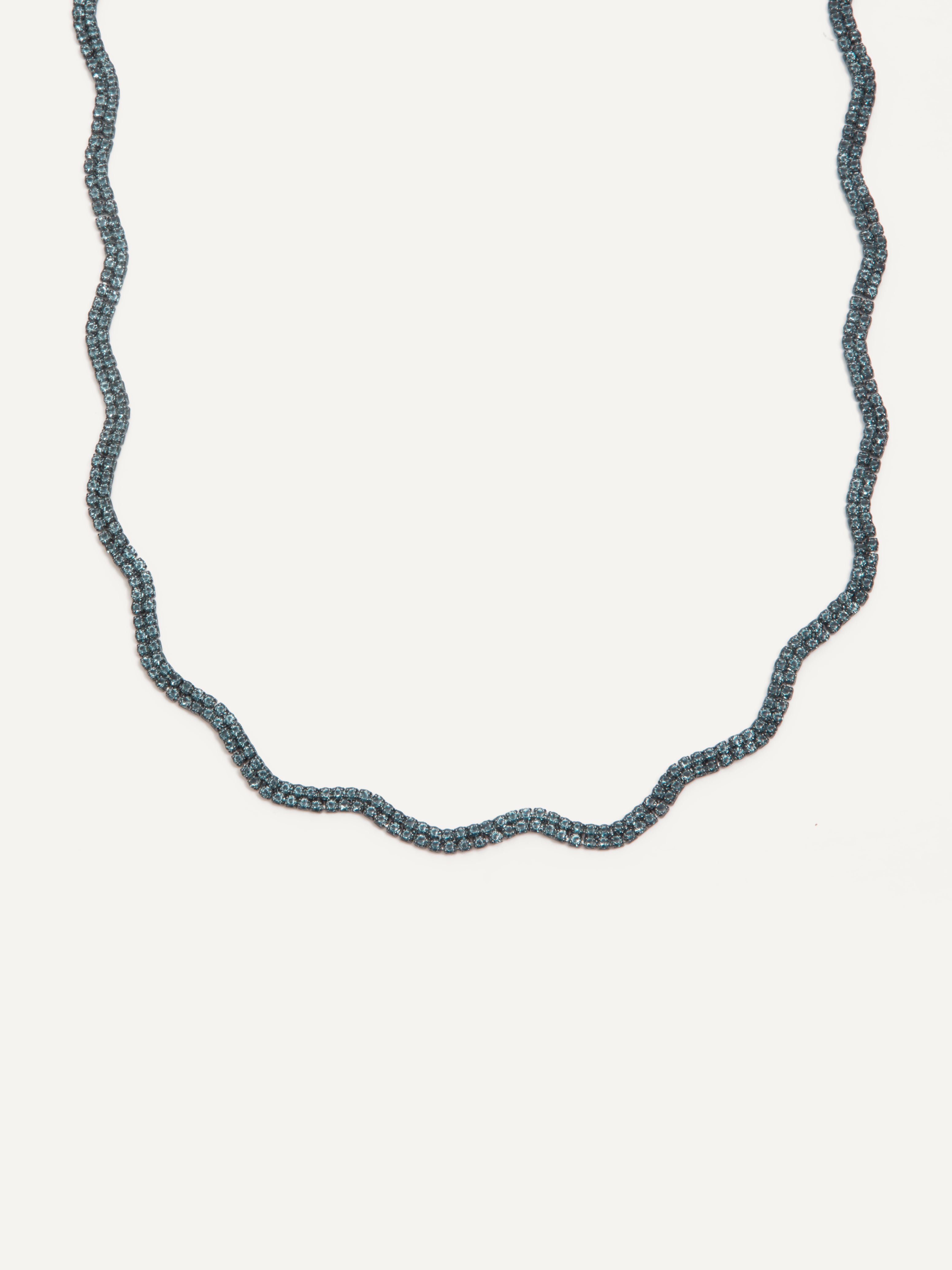 This necklace effortlessly blends timeless elegance with a modern twist. Its fluid wavy design adorned with radiant crystals and a striking metallic red finish make it a perfect statement piece for any occasion.