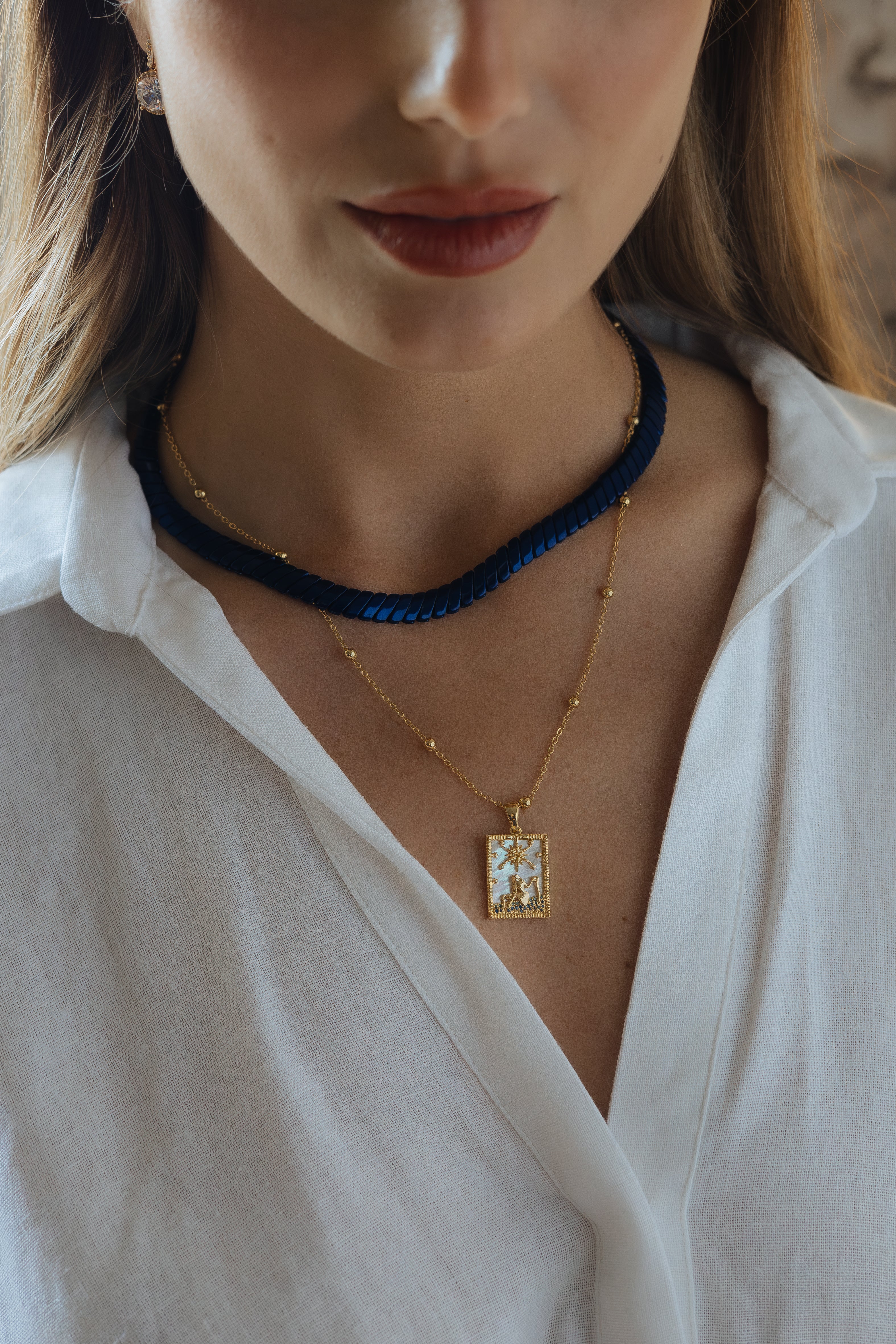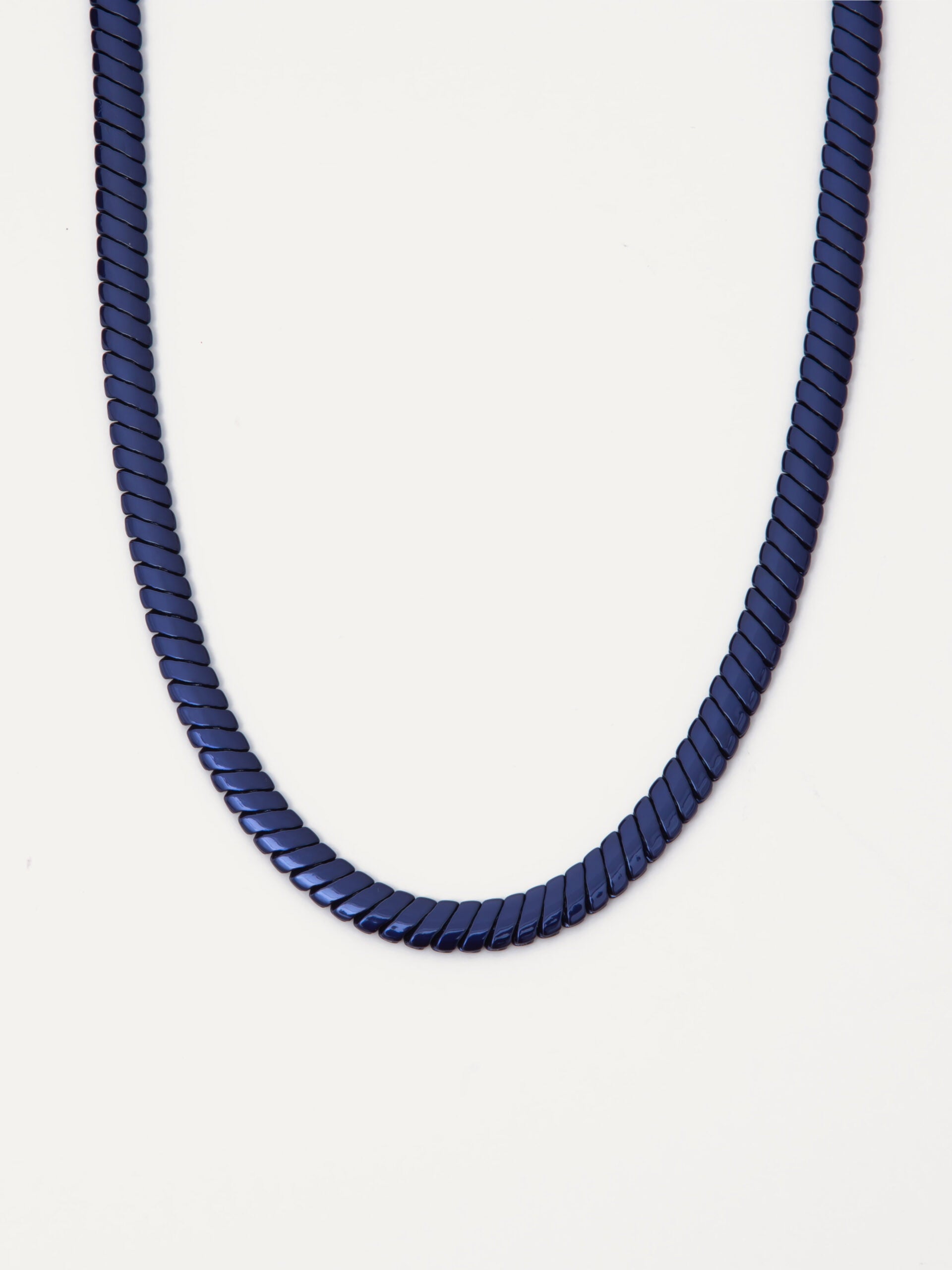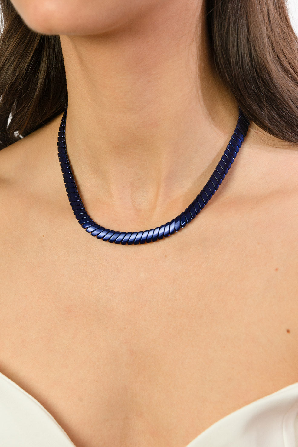 Our River necklace is a statement piece crafted with a unique enameled technique for a shimmering “Aurora Borealis” finish. This thick snake chain is designed to stand out, combining boldness with a touch of iridescent elegance that will capture all the attention.