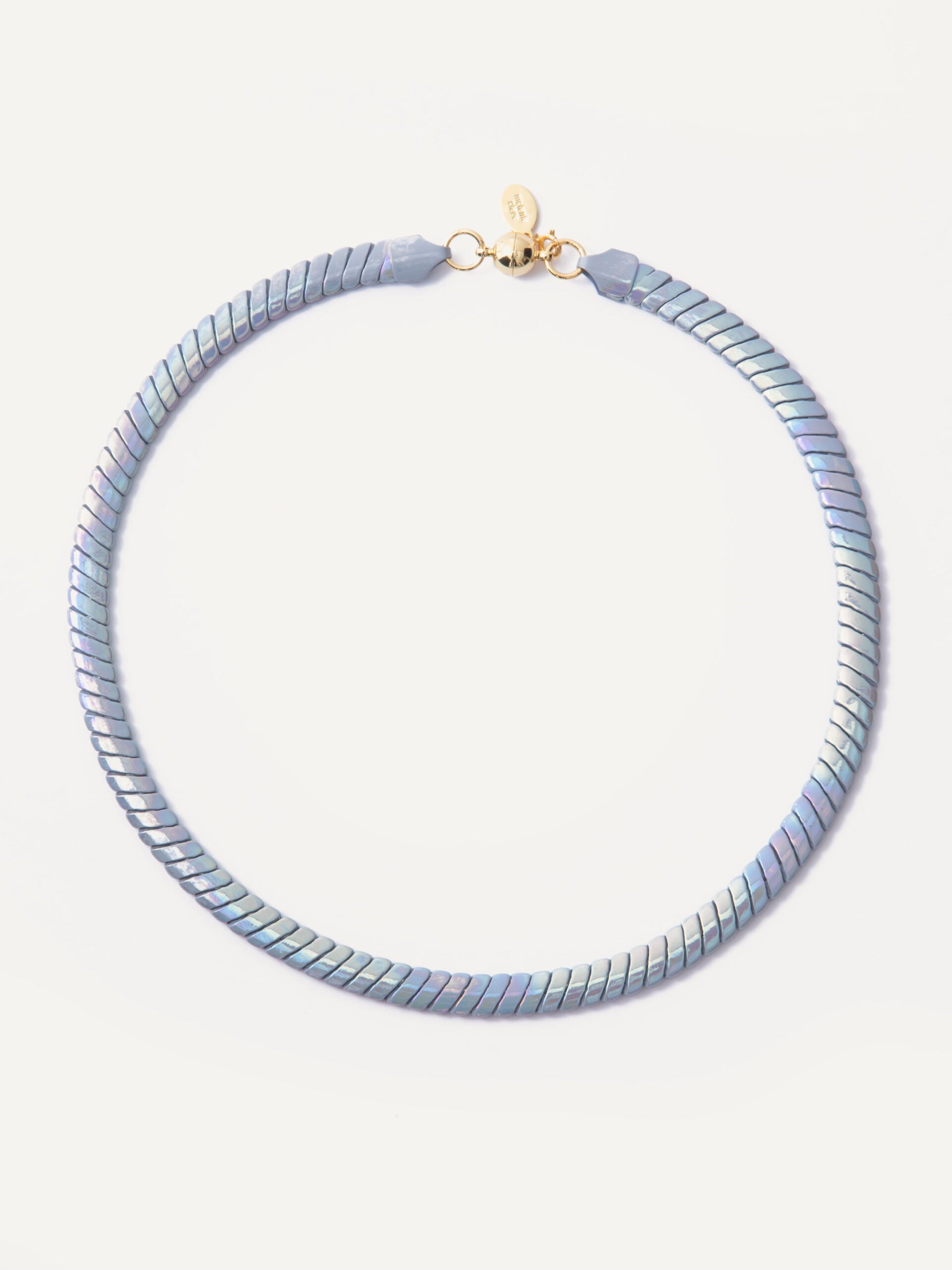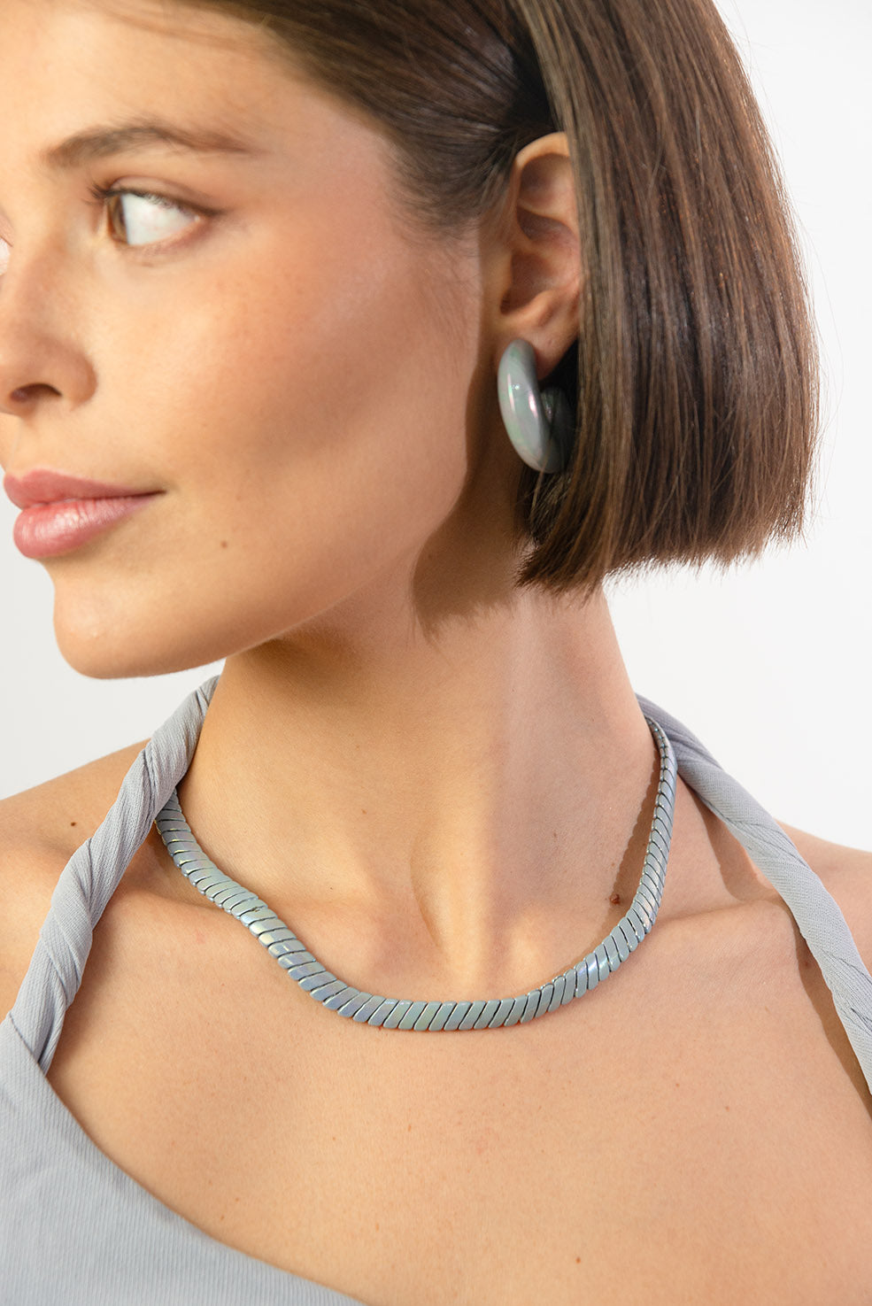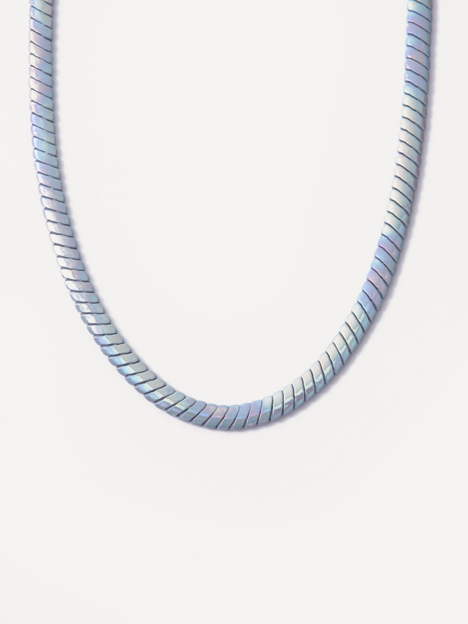 Our River necklace is a statement piece crafted with a unique enameled technique for a shimmering “Aurora Borealis” finish. This thick snake chain is designed to stand out, combining boldness with a touch of iridescent elegance that will capture all the attention.