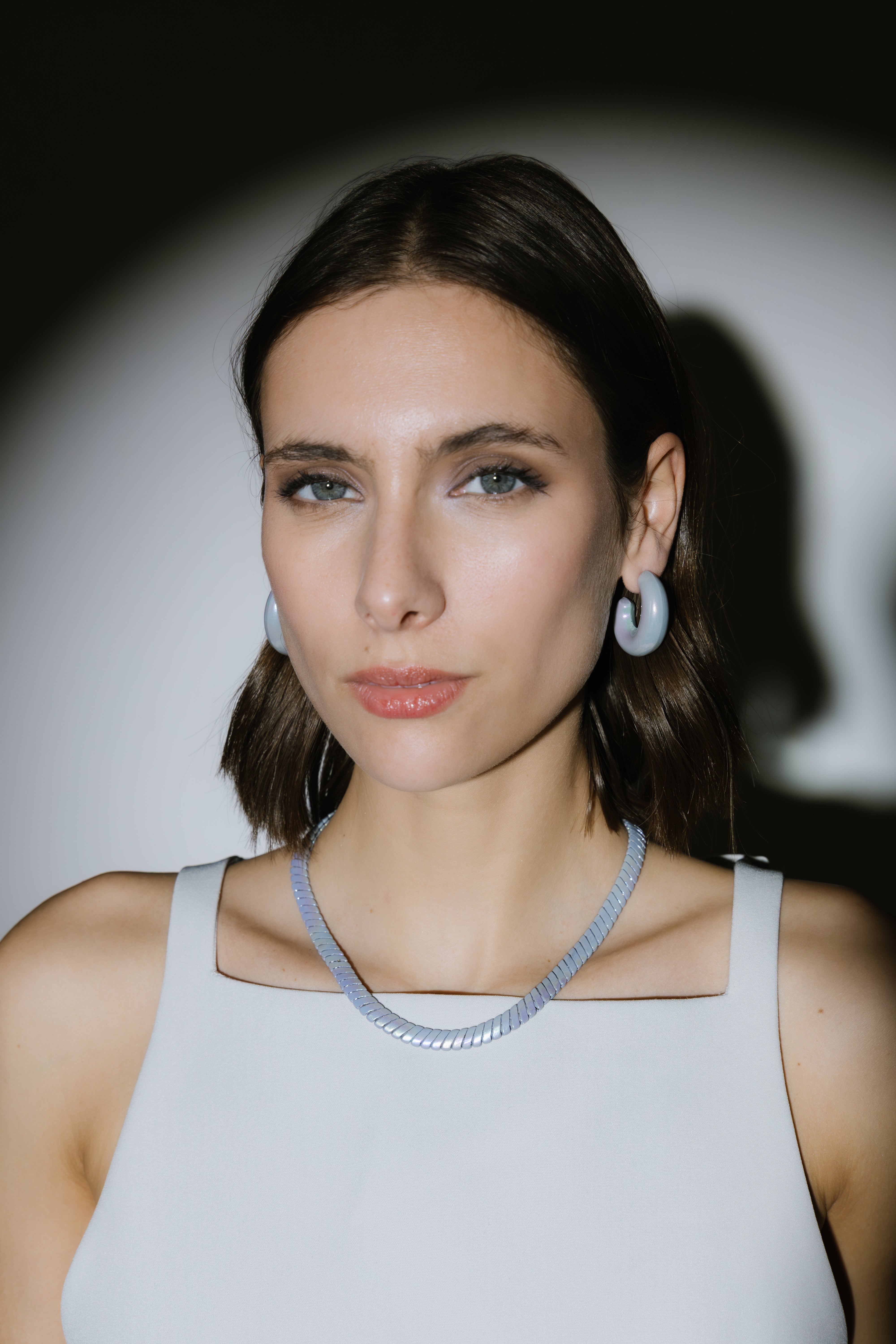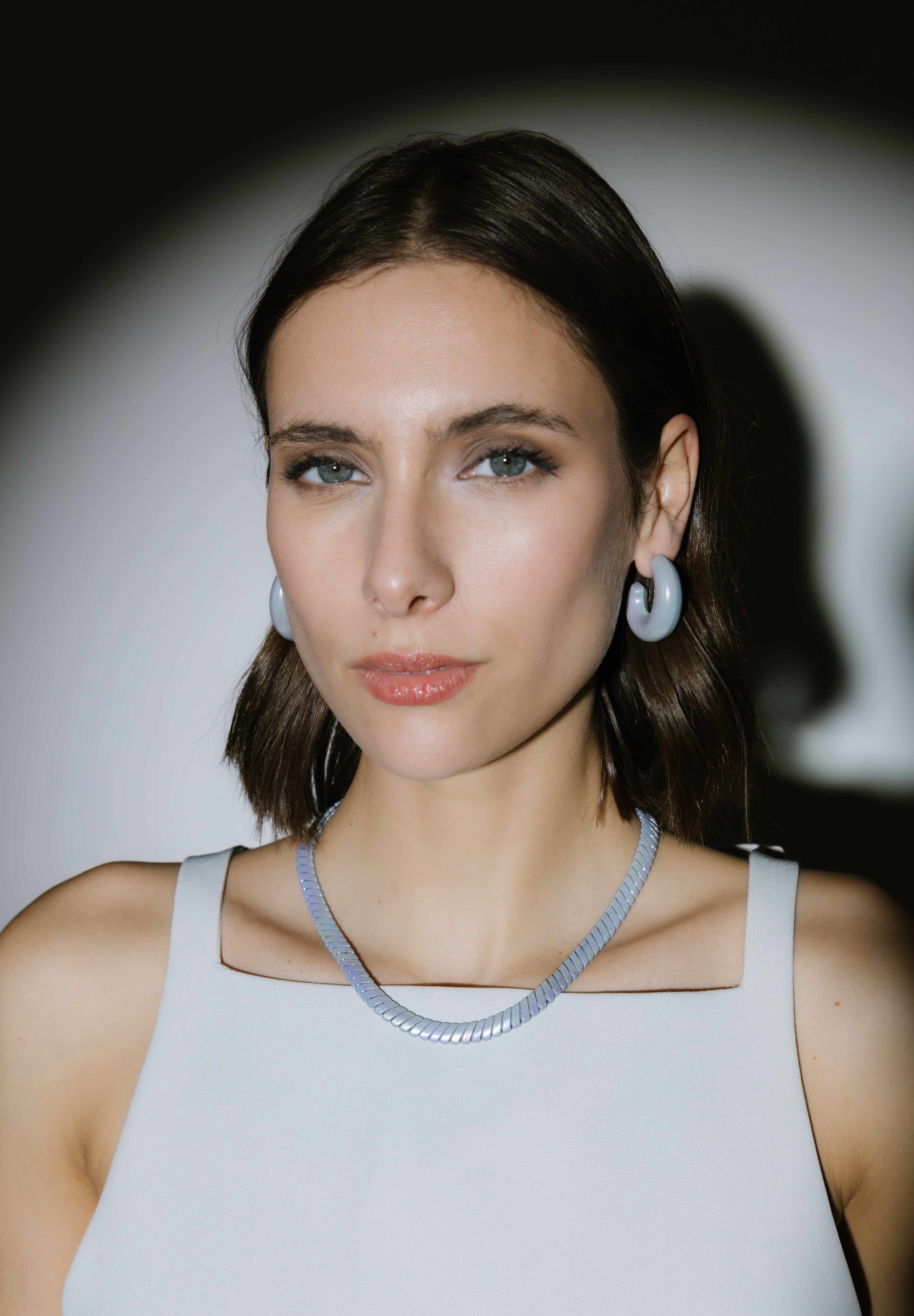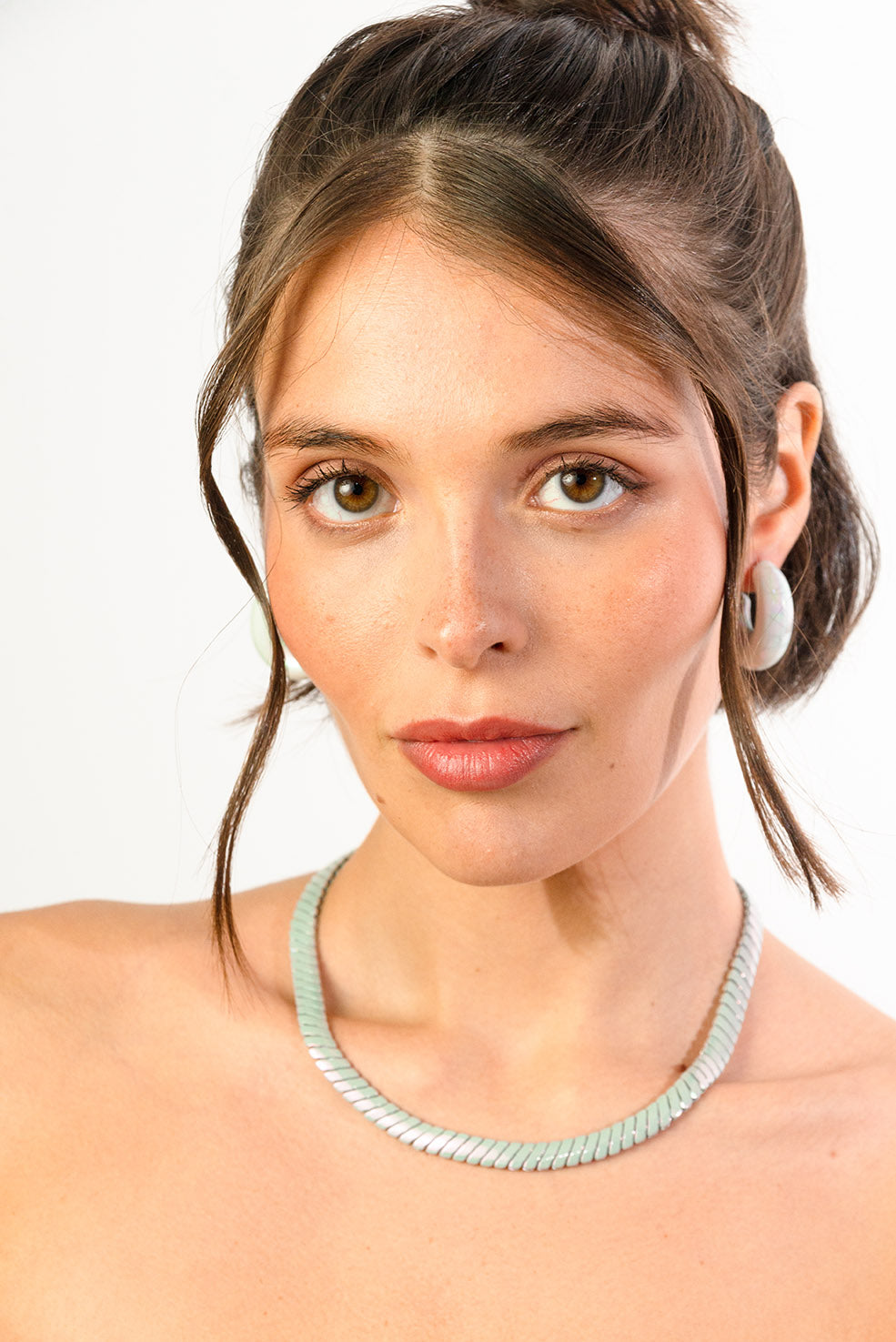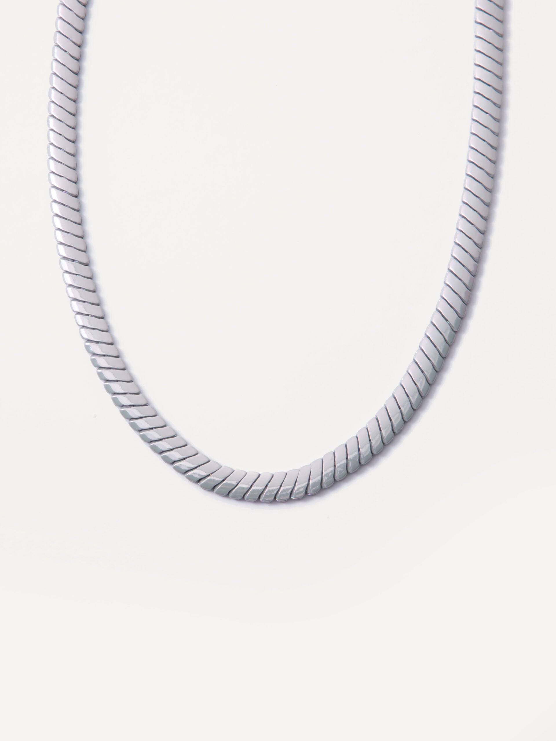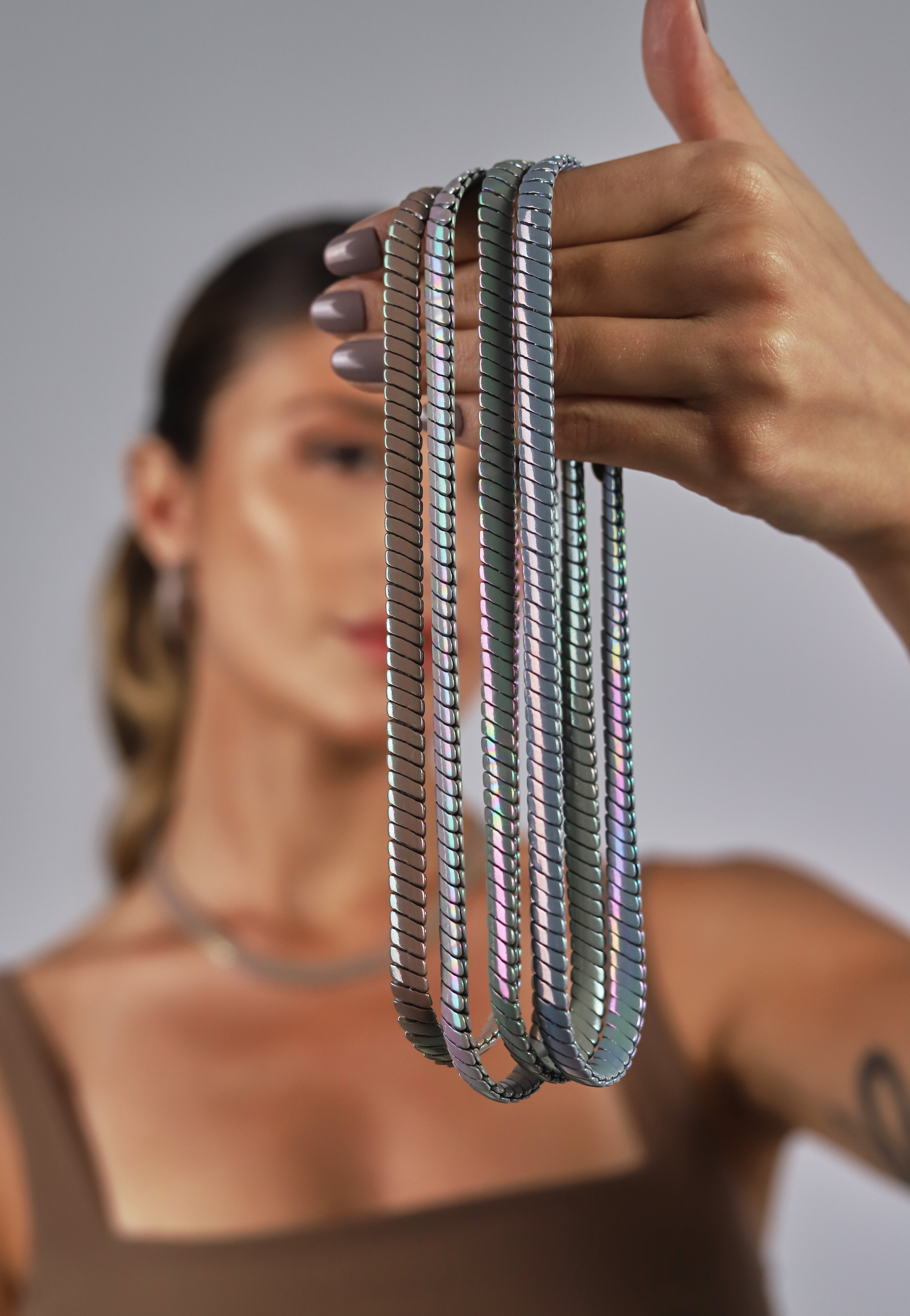 Our River necklace is a statement piece crafted with a unique enameled technique for a shimmering “Aurora Borealis” finish. This thick snake chain is designed to stand out, combining boldness with a touch of iridescent elegance that will capture all the attention.