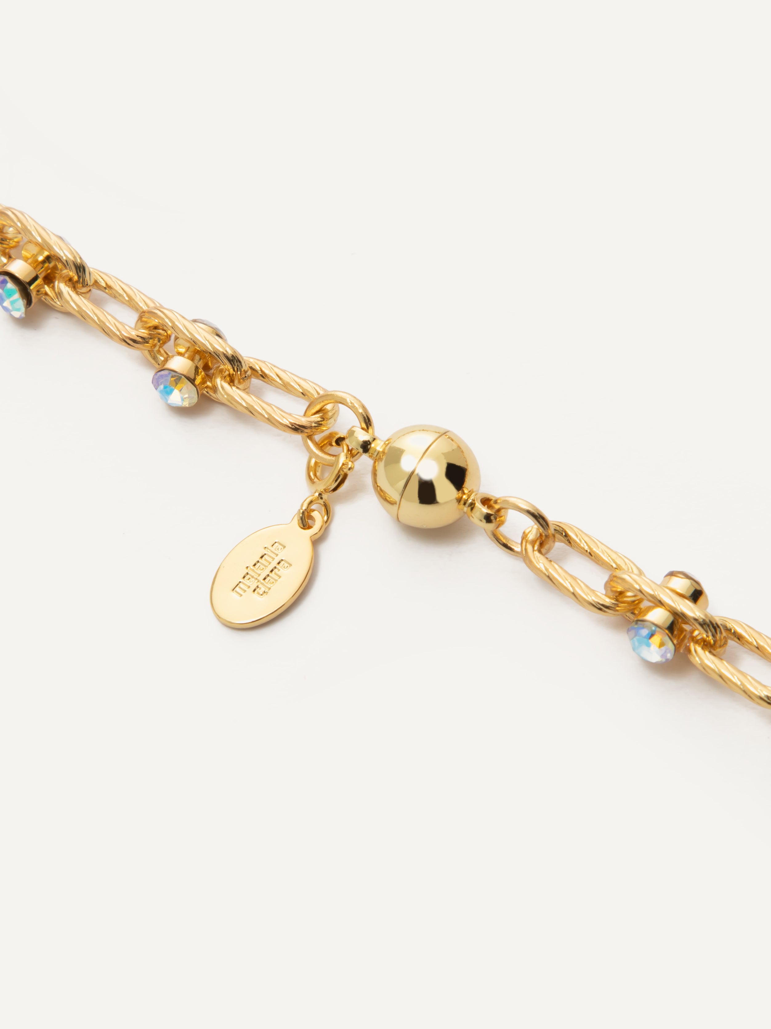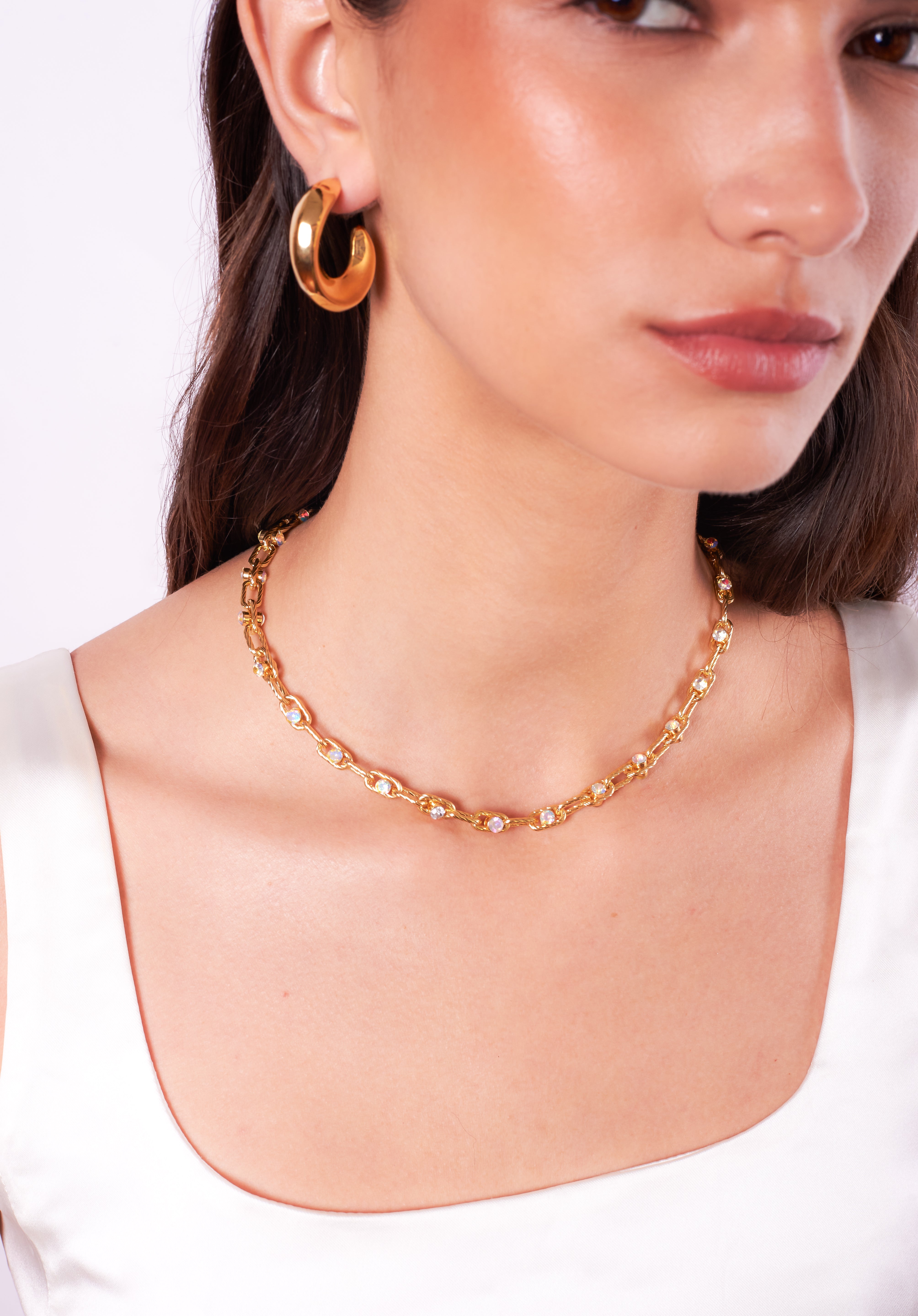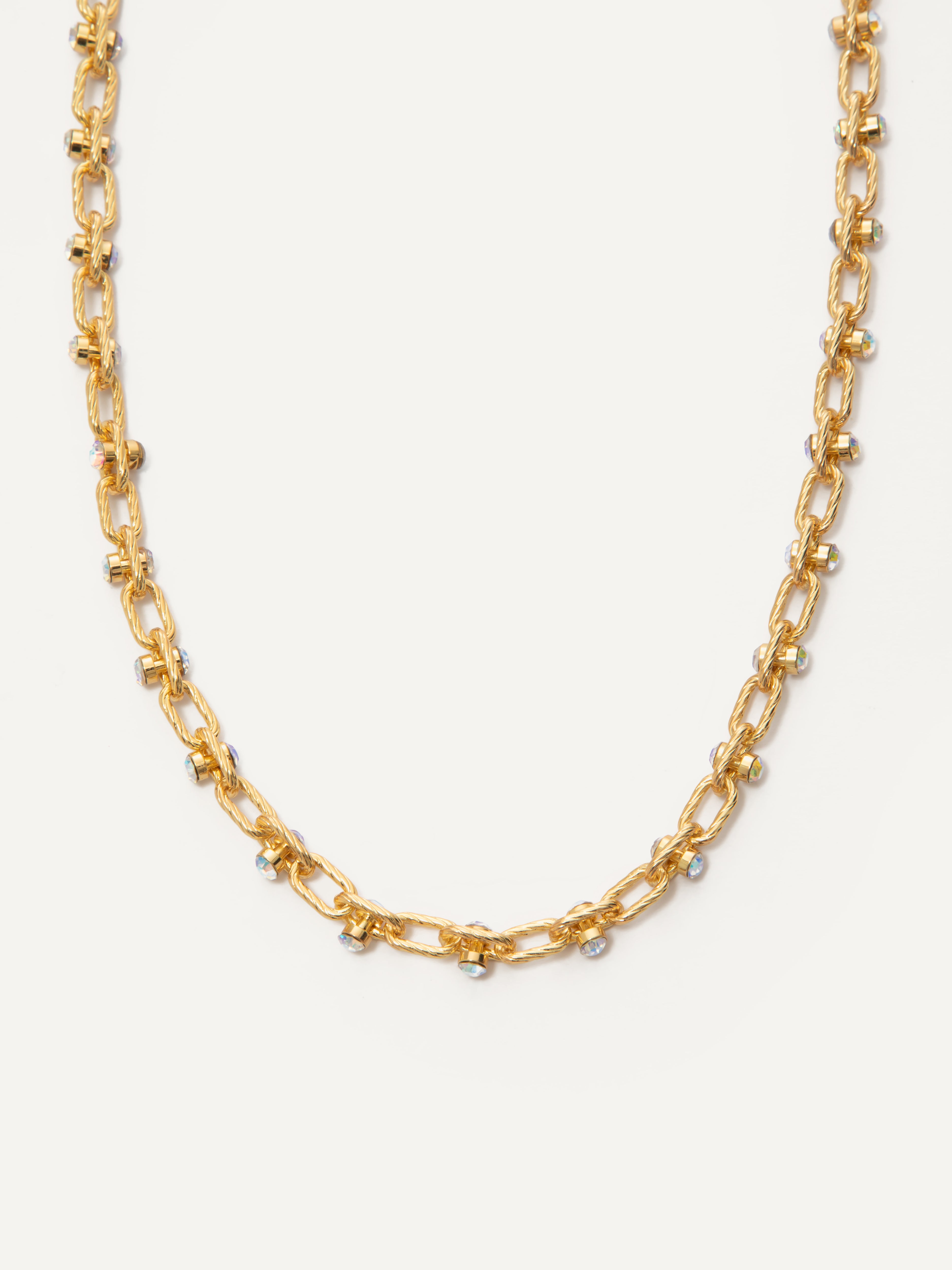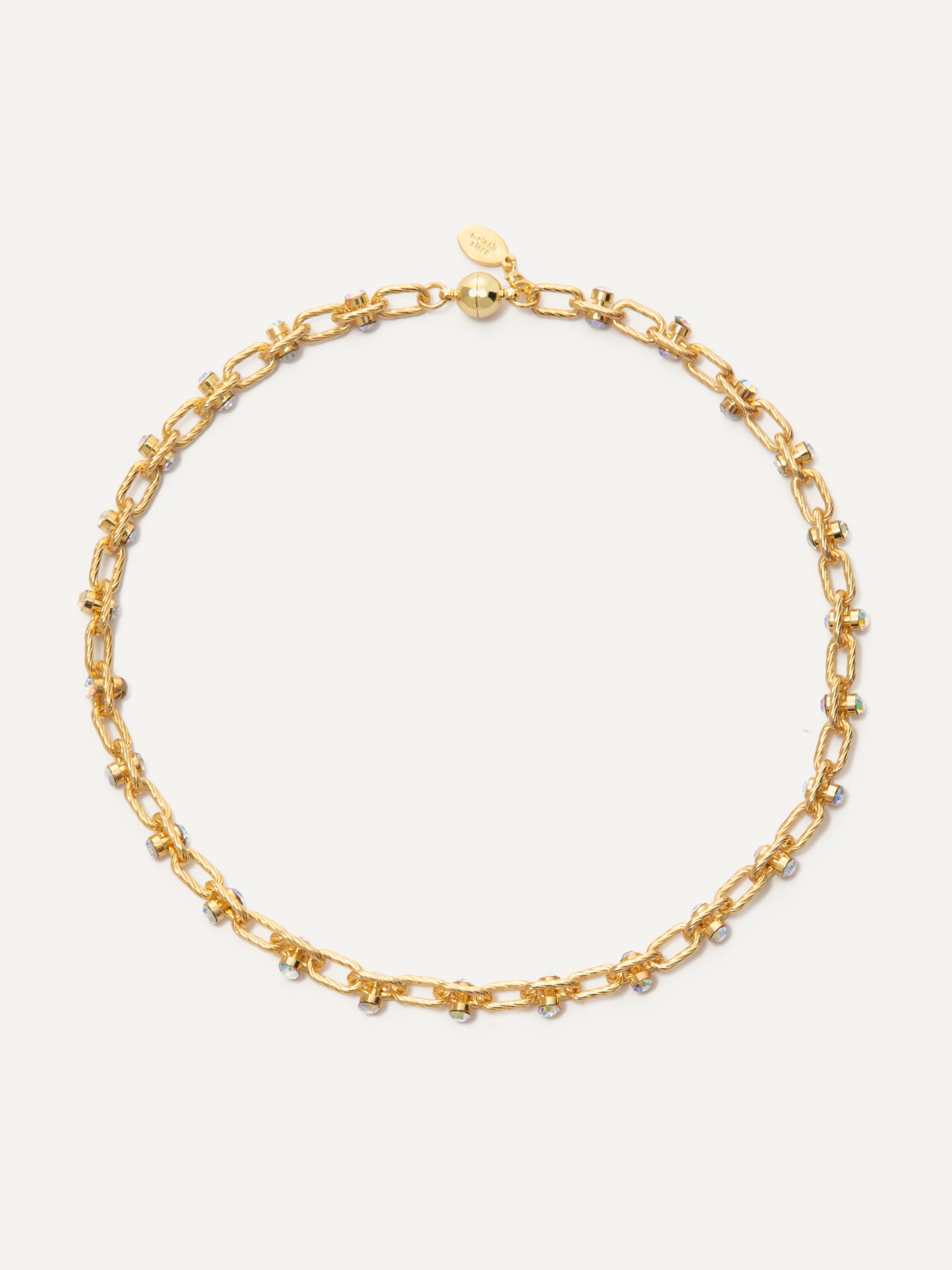 Make a statement with this stunning necklace, where textured links meet iridescent crystals for a look that’s both elegant and edgy.
